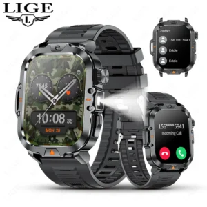 LIGE Men’s Watch Outdoor Flashlight Military IP68 Waterproof Smart Watch Men Heart Rate Sport Fitness Watches BT Call Smartwatch