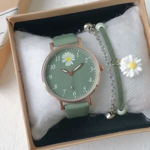 Harajuku Style Daisy Children’s Watch Simple Quartz Leather Green Pink Watches for Girls with Bracelet Watch Box Gift Reloj