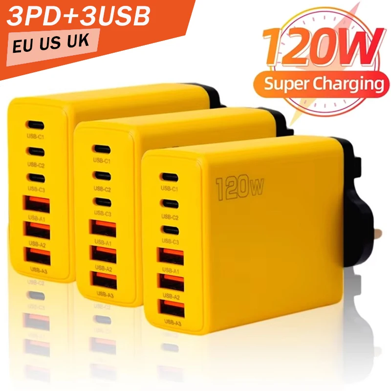 [High compatibility]:120W USB Charger Fast Charging Type 3PD+3USB Mobile Phone Adapter EU/US/UK Plug Quick Chargers for IPhone 16 15 Samsung Xiaomi