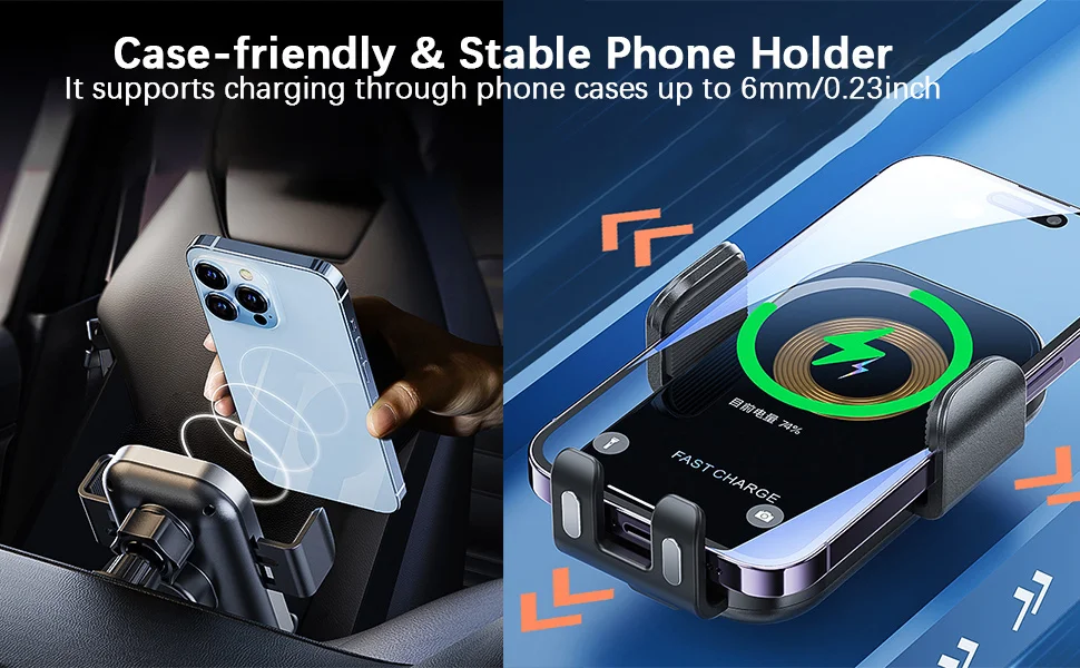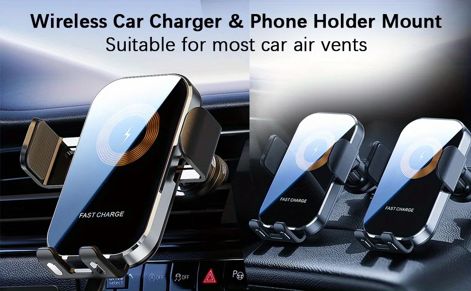 Wireless Car Charger Mount Upgraded And Unique Design 1. Clip Arm And Bottom With Flexible Silicone Pad, Thickened Bottom Bracket For Better Phone Protection. 2. Car Charging Phone Holder With Upgraded 360° Rotatable Metal Hook And 360° Rotatable Ball Vent Clip. For Optimal Viewing And Safe Driving 3. 15W Fast Wireless Charging With A Heat Sink On The Back To Ensure Fast Charging Without Harming Your Phone.