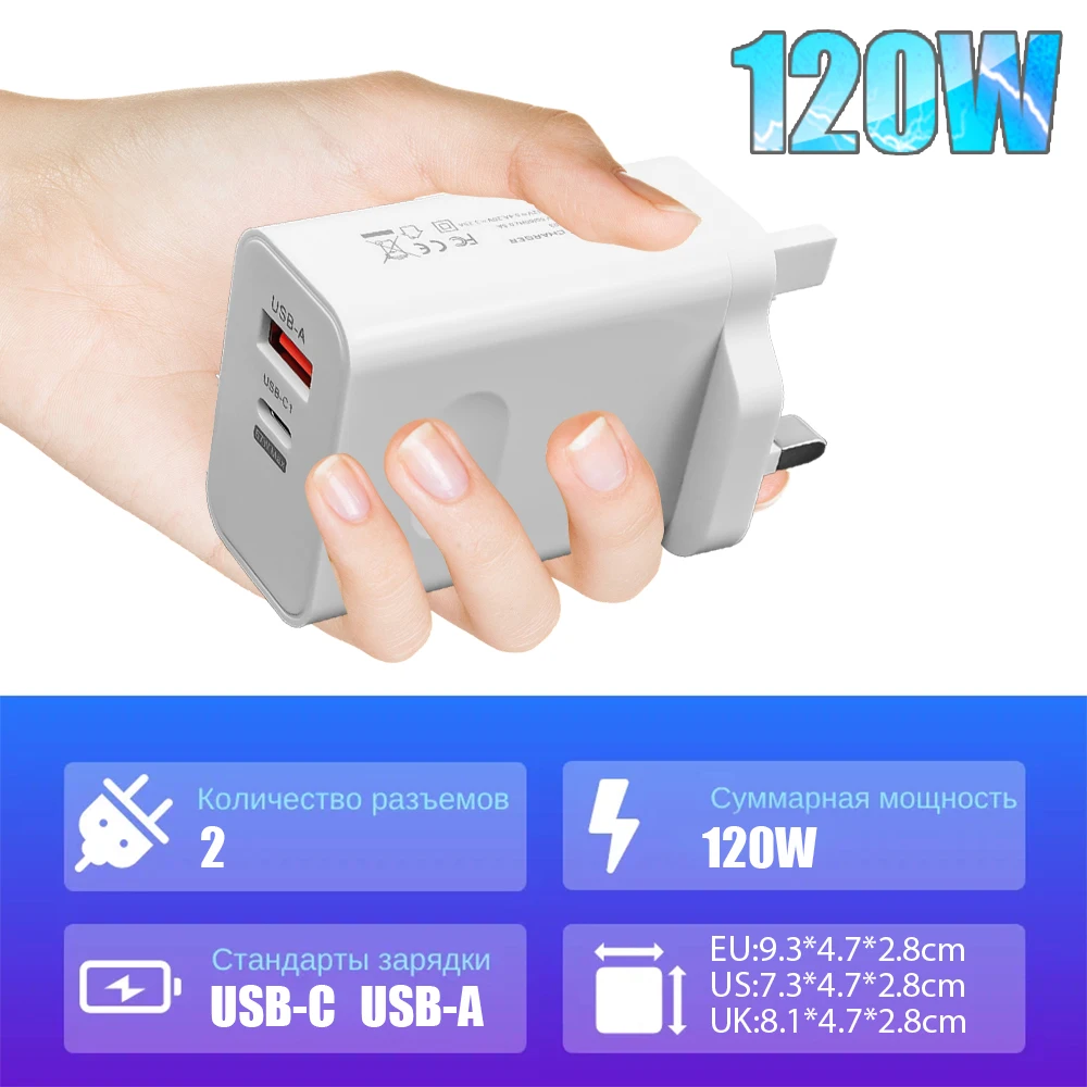 2 Ports USB A PD 120W Charger EU/US/UK Fast Charging Phone Type-C Charger QC 3.0 Adapter Head for iPhone Samsung Xiaomi Redmi