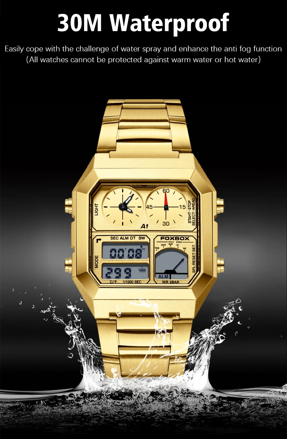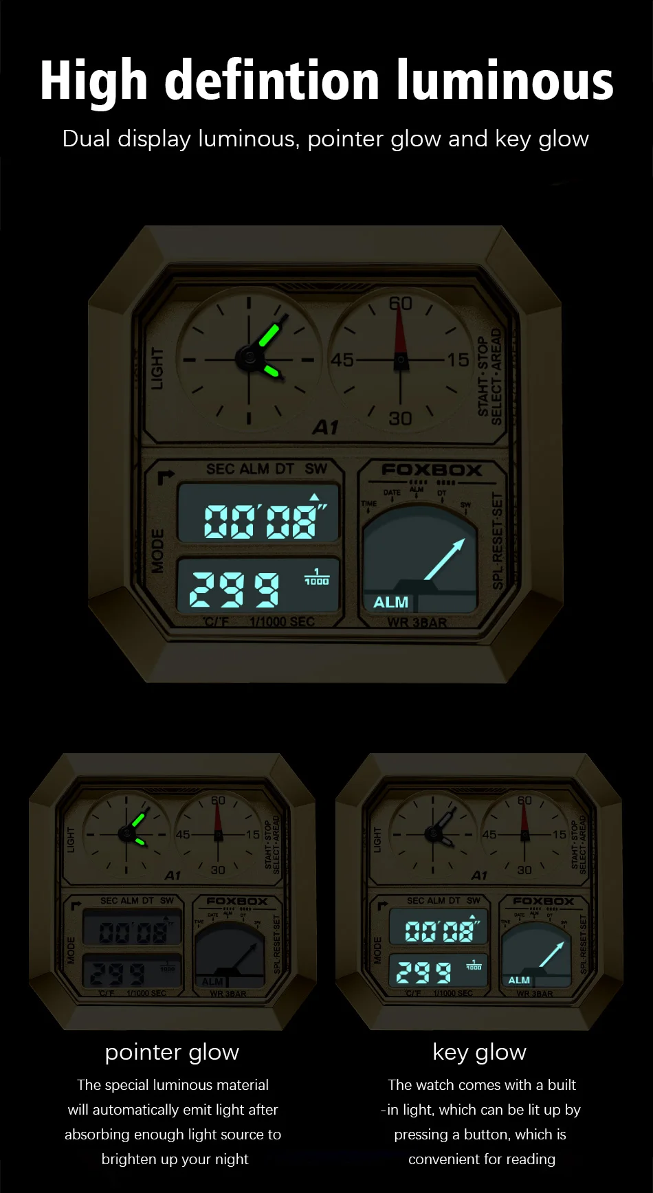 - Feature: STOP WATCH,Back Light,Shock Resistant,LED display,Repeater,Luminous,Auto Date,Chronograph,Complete Calendar,Water Resistant,Alarm,swim,Week Display,luminous hands