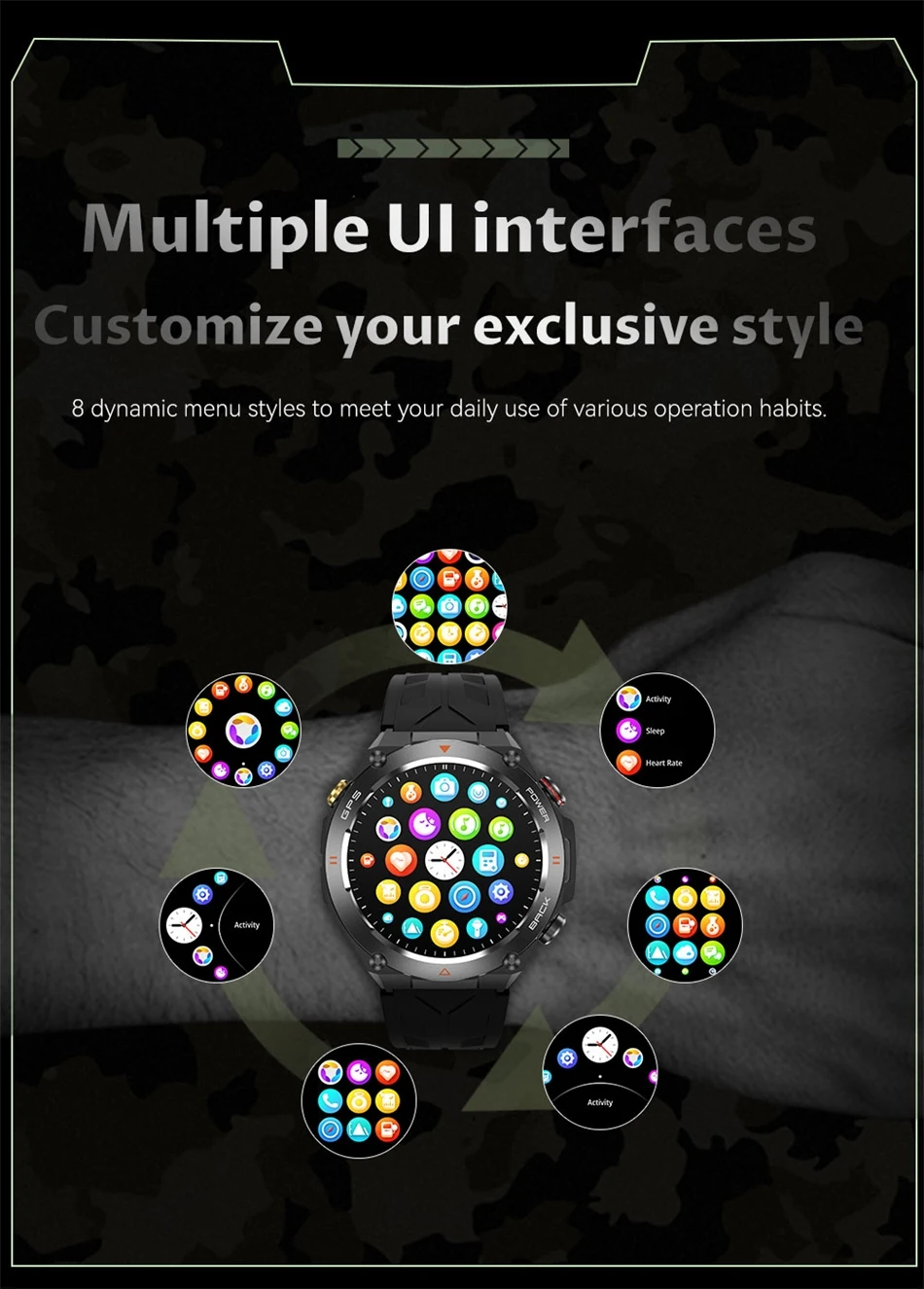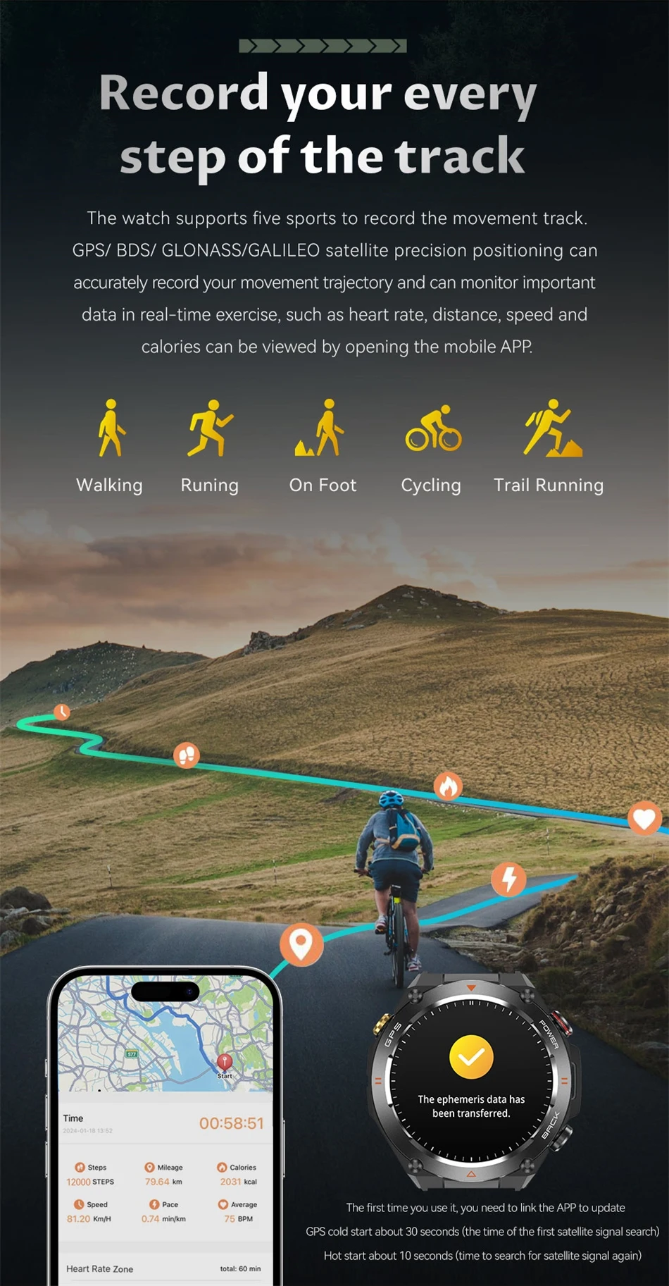 The watch supports five sports to record the movement track, GPS/BDS/GLONASS/Galileo satellite precise positioning can accurately record your movement track. And you can monitor important data in real-time sports, such as heart rate, distance, speed and calories, etc. Open the cell phone APP can be viewed!