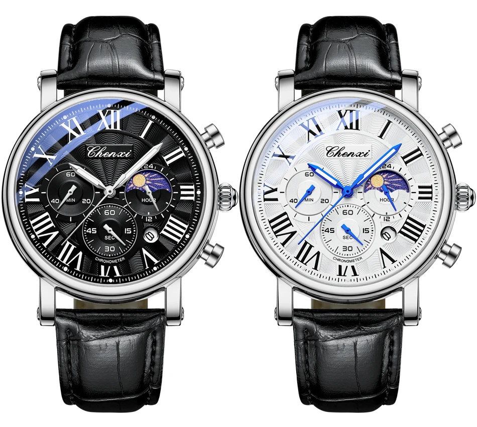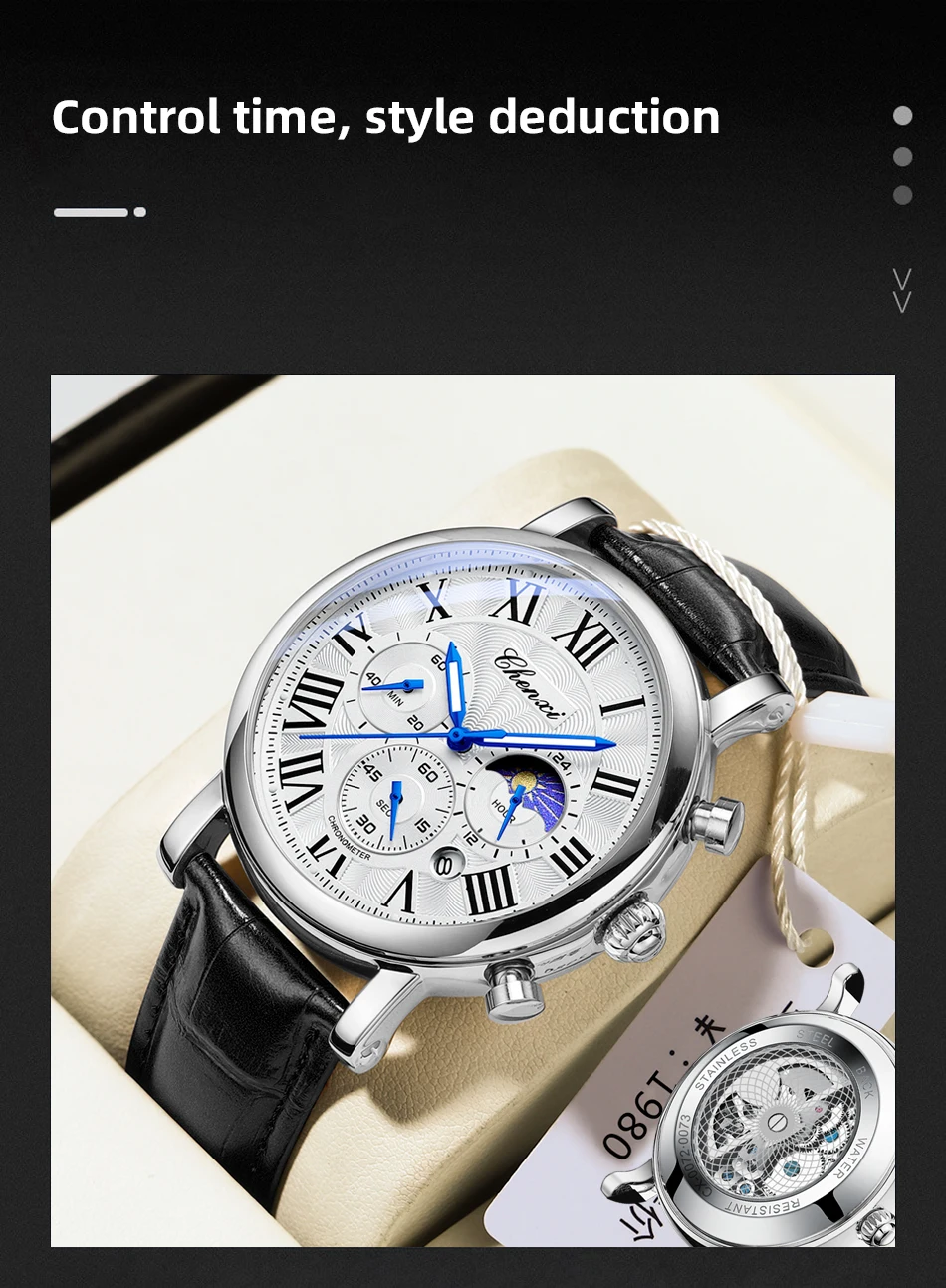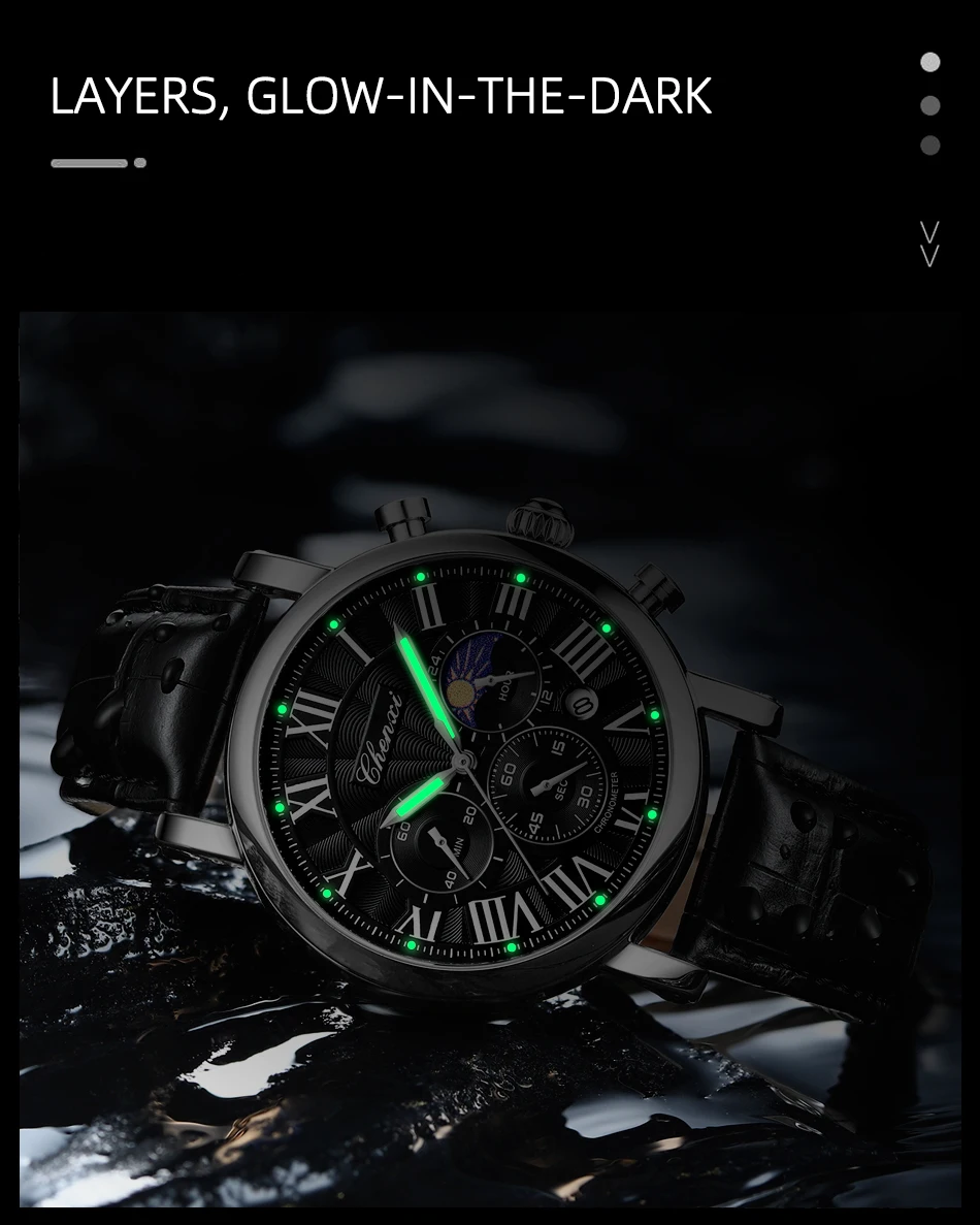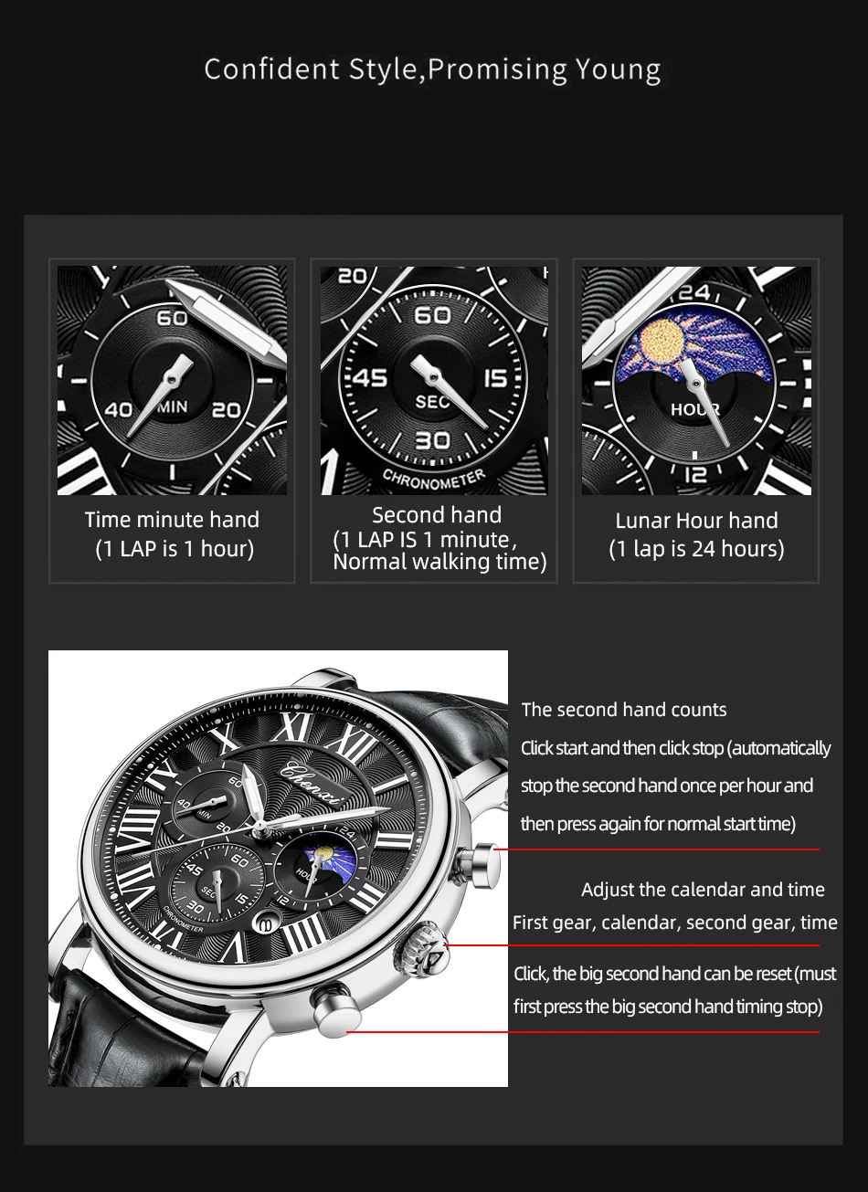– Luminescent hands/water-resistant/moonphase/chronograph