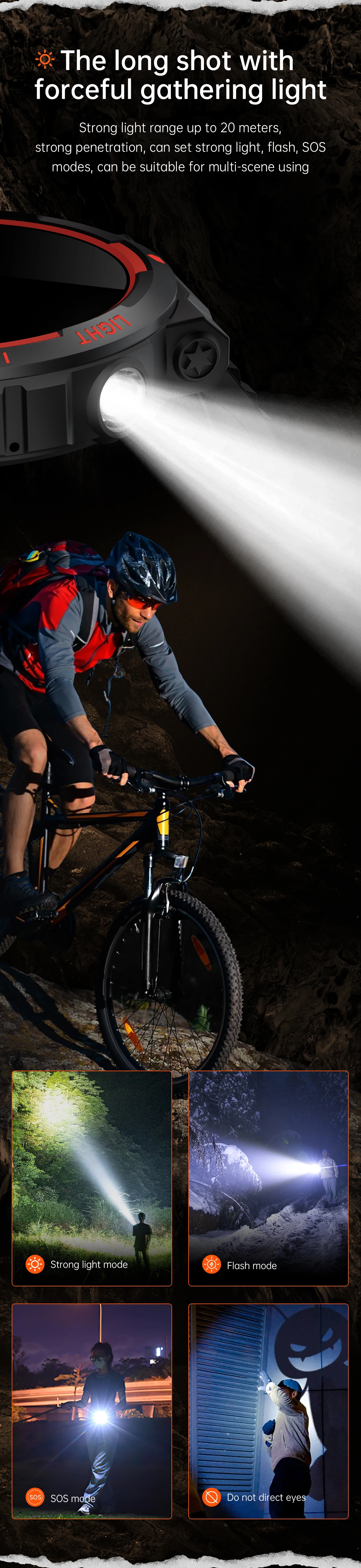 EIGIIS men’s outdoor sports smart watch has a built-in LED flashlight on the right side, which can be set to three modes: direct bright light, burst flash and SOS. It is a good assistant for your outdoor trips.