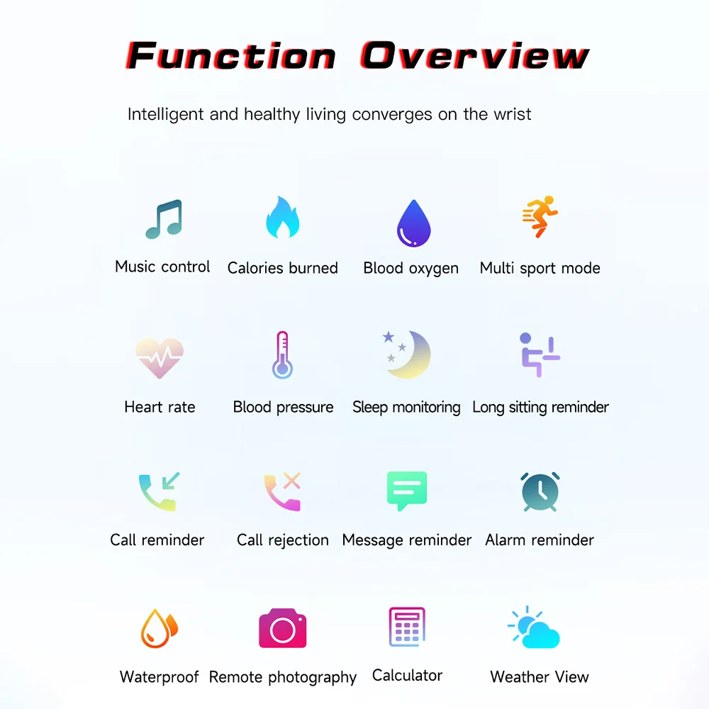 - Function: Passometer,fitness tracker,sleep tracker,Message Reminder,Call Reminder,Answer Call,Dial Call,REMOTE CONTROL,Push Message,Big Three Needles,24 hour instruction,Alarm Clock,Small Second,Heart Rate Tracker,Interactive Music,Calculators,Oxymeter