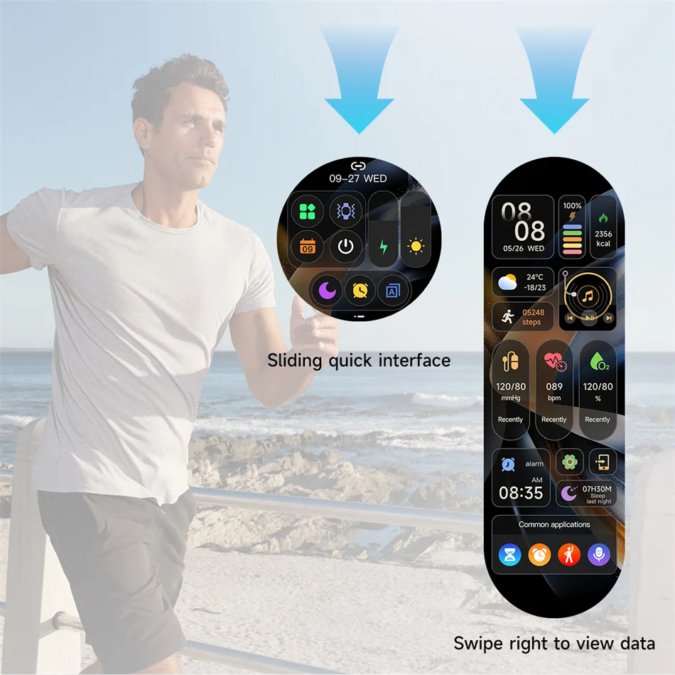 Swipe right: split screen (weather, sleep, heart rate, blood pressure, blood oxygen, music, common applications).