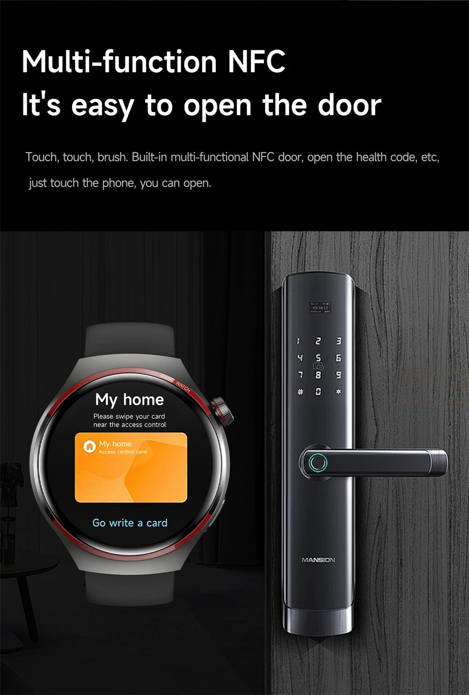 Dear friends, thank you very much for your support, this is a multifunctional smart watch! This product has many very useful features! For example, with the NFC function, you can open the door through your watch! Bluetooth calling function, you can make calls directly after connecting to the Bluetooth of your mobile phone! AI voice assistant function, enable watch functions through voice! The sports mode function can monitor your exercise time, distance, steps, calorie consumption, heart rate changes, etc. in real time! There are also some medical functions that can monitor body temperature, sleep, blood pressure, blood oxygen, and heart rate to keep an eye on your health! These are very useful features!