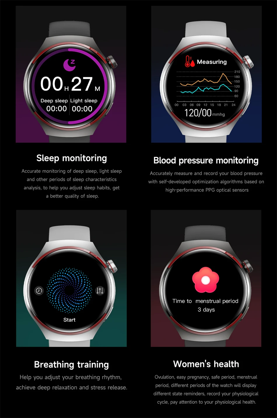 Health management function:Sleep monitoring, Heart rate monitoring, Body temperature monitoring, Blood pressure monitoring, Blood oxygen monitoring, Breathing training, Female menstrual cycle management