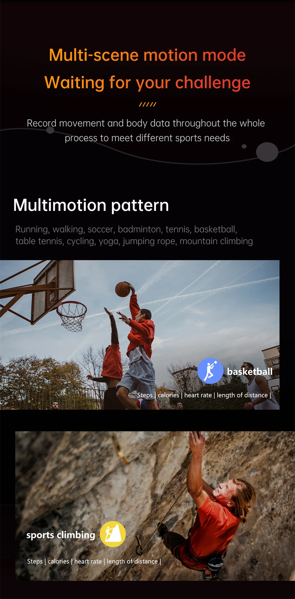 Professional Sports Mode:Various sports modes such as running, Football, Badminton, Walking, Tennis, Basketball, Table tennis, cycling, Yoga, Mountain climbing and so on.