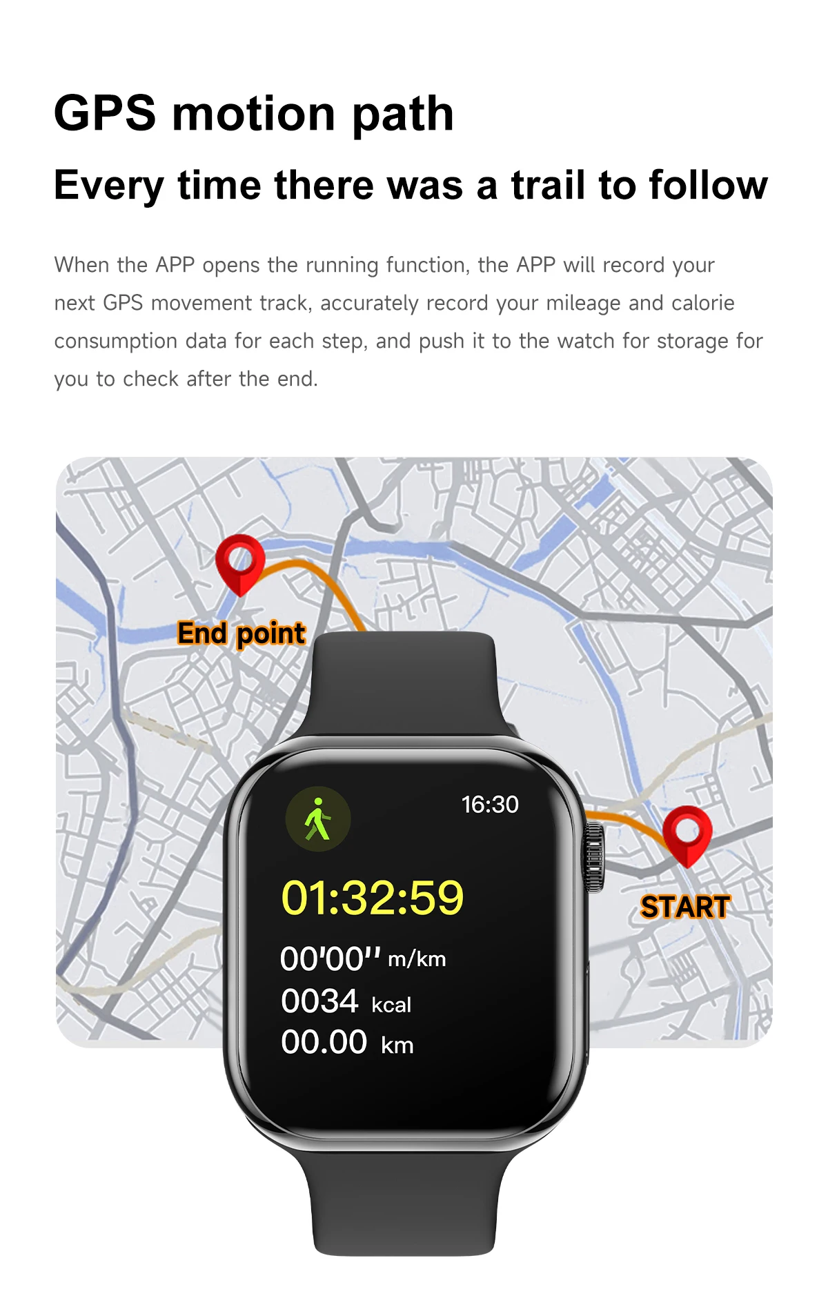 2.【GPS motion trajectory】When the APP opens the running function, the APP will record your next GPS movement track, accurately record your mileage and calorie consumption data for each step, and push it to the watch for storage for you to check after the end.