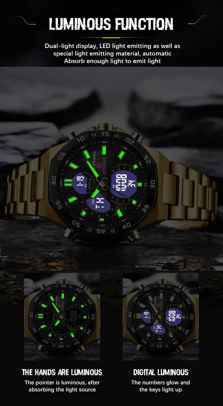 - Feature: STOP WATCH,Shock Resistant,LED display,Luminous,Auto Date,Chronograph,Complete Calendar,DIVER,Water Resistant,Alarm,swim,Week Display,luminous hands