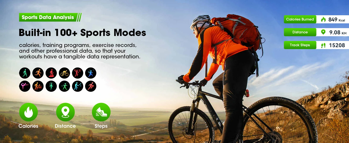 Steps, calories, distance, and multiple exercise modes can support exercise modes (outdoor running, cycling, skipping rope, badminton, table tennis, tennis, climbing, brisk walking, basketball, football, baseball, volleyball, cricket, rugby, field hockey, dance, dynamic cycling, yoga, sit ups, indoor running, gymnastics, rowing, jumping, free training, etc.)