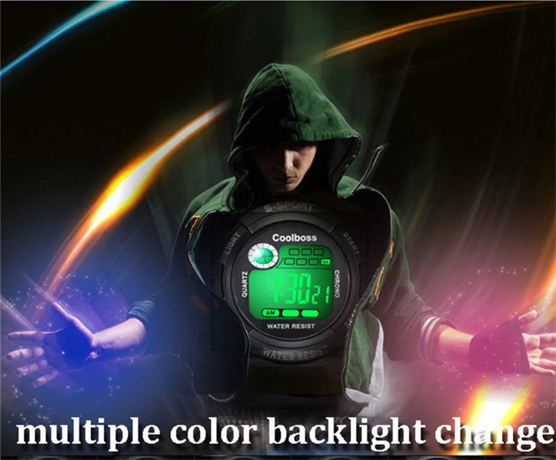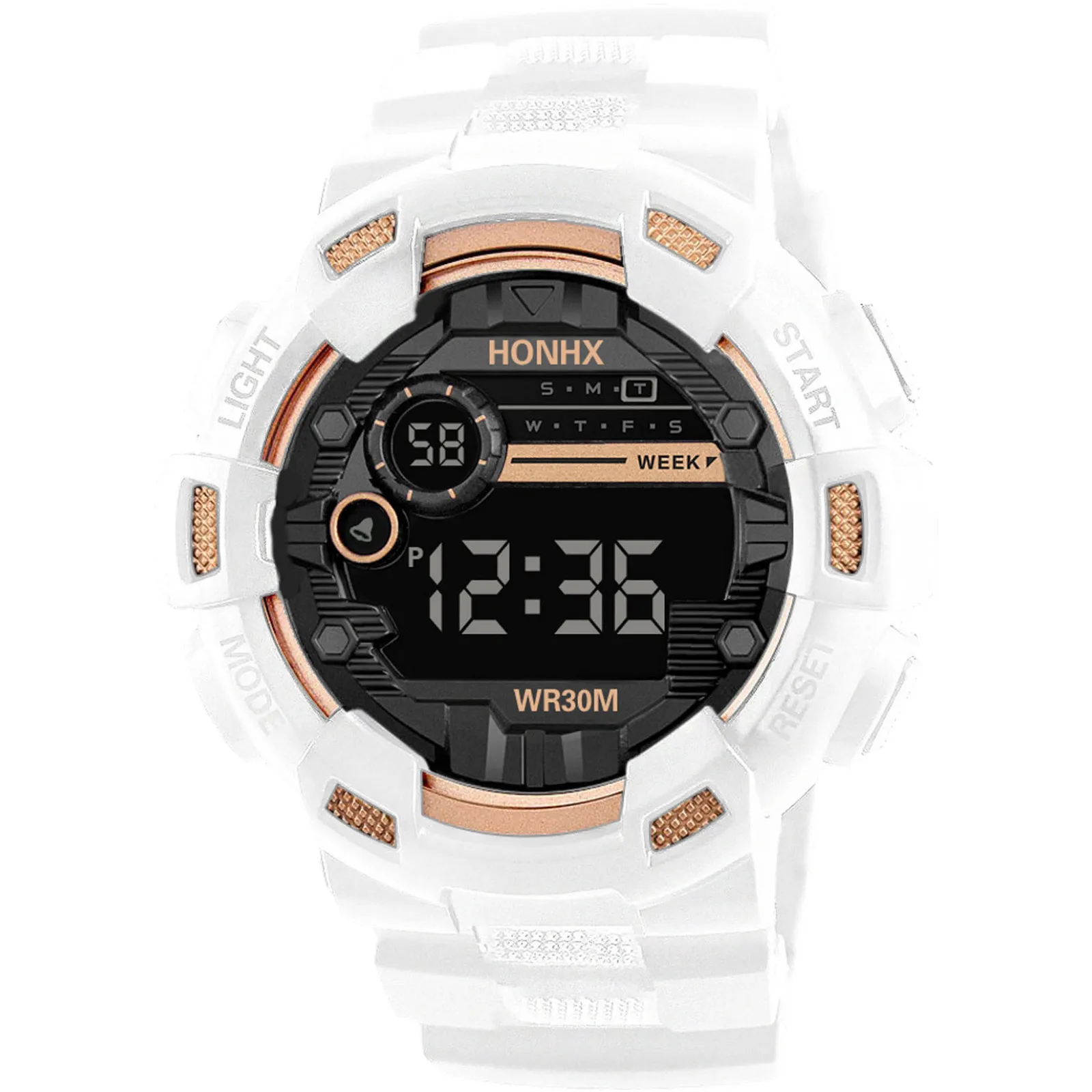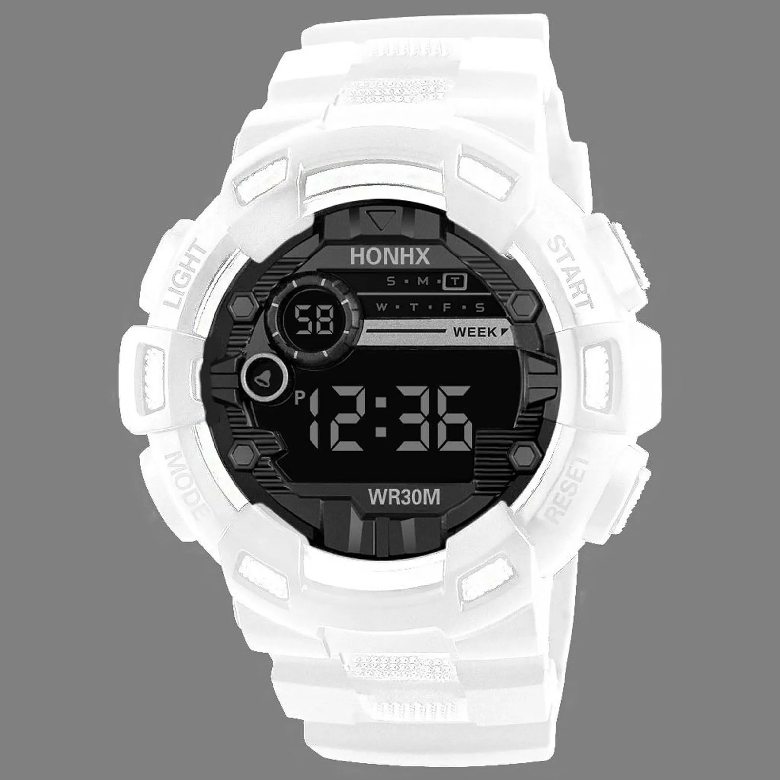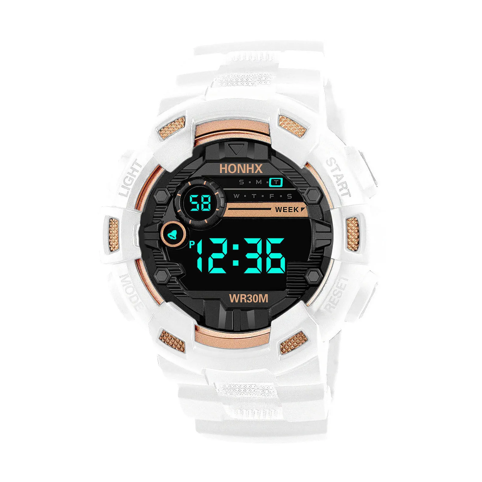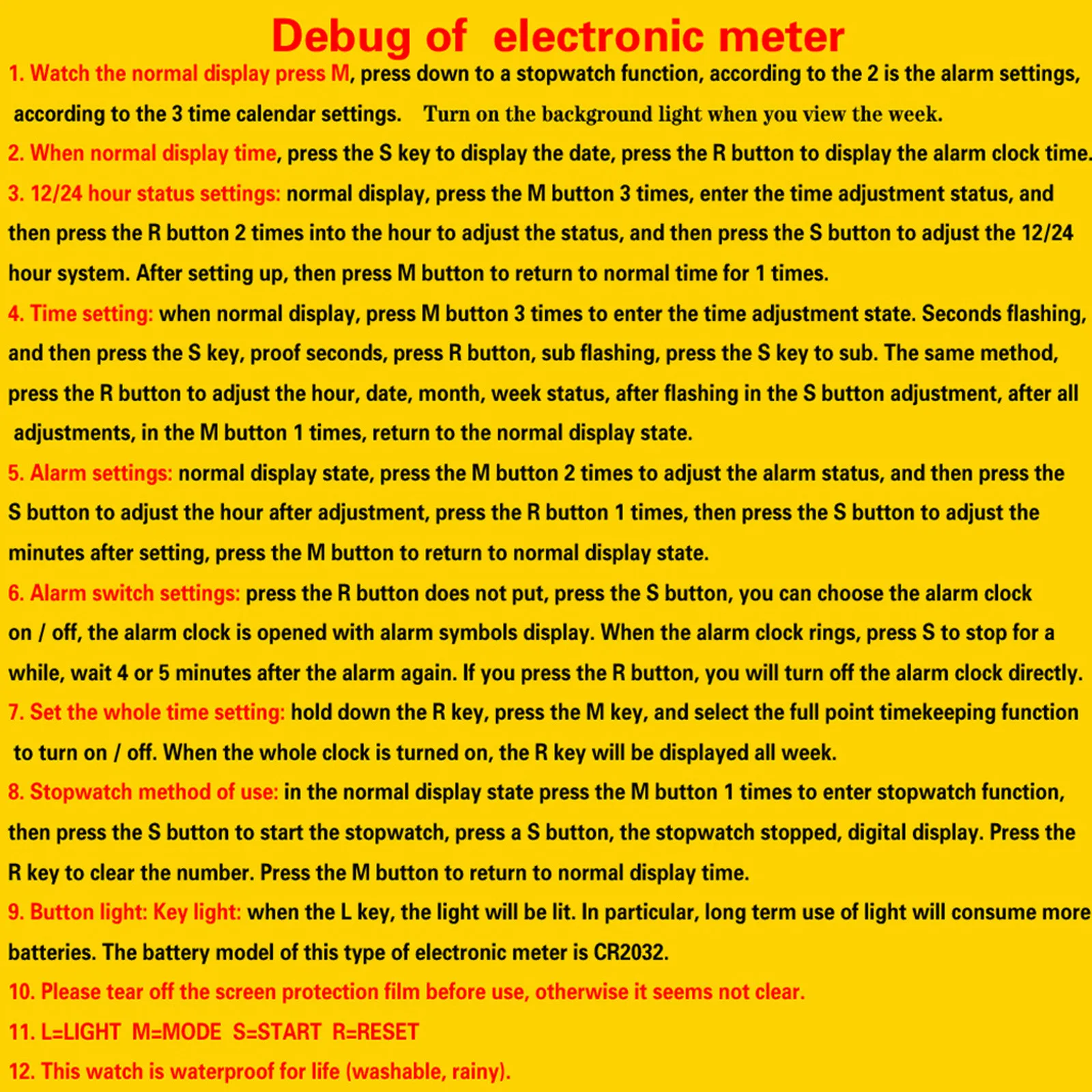 Stopwatch, alarm clock, hour reminder, luminous, date/week display, 12/24 hour time, life waterproof