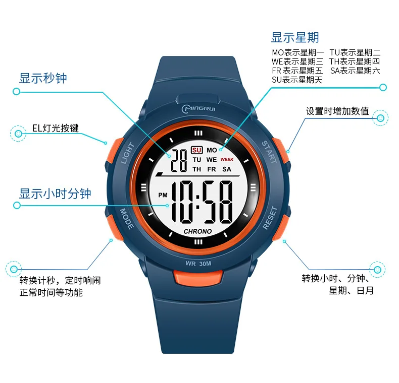 14. Special functions: night light, calendar, week display, waterproof, alarm clock, running time