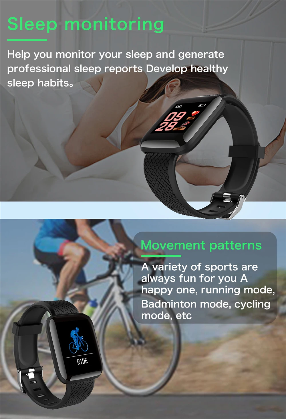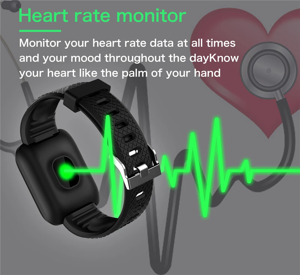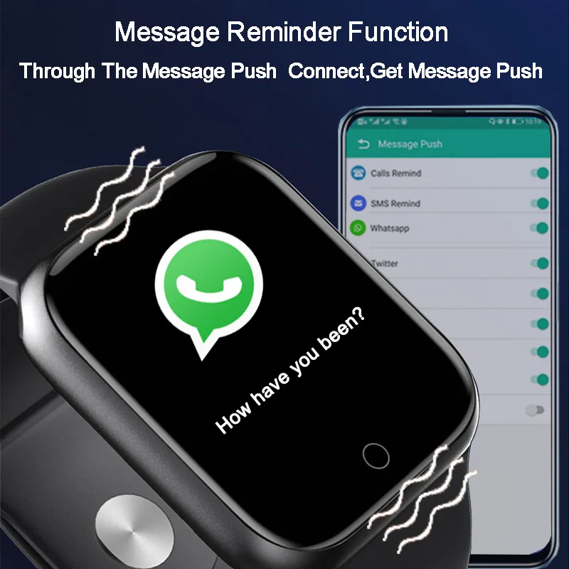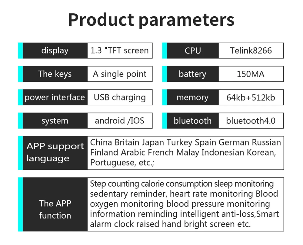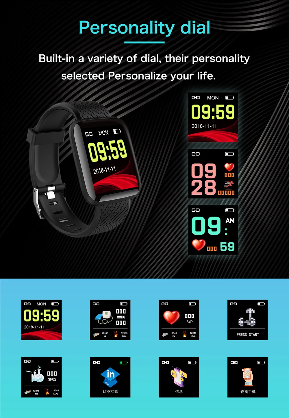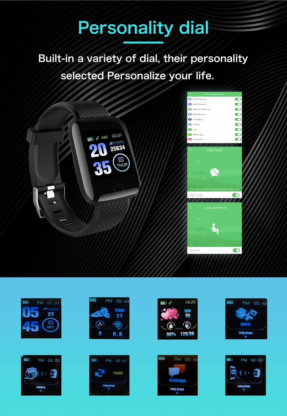 Blood Pressure, Passometer, Sleep Tracker, Push Message, Heart Rate Tracker, Alarm Clock, Remote Control, Social Media Notifications, Message Reminder, Call Reminder