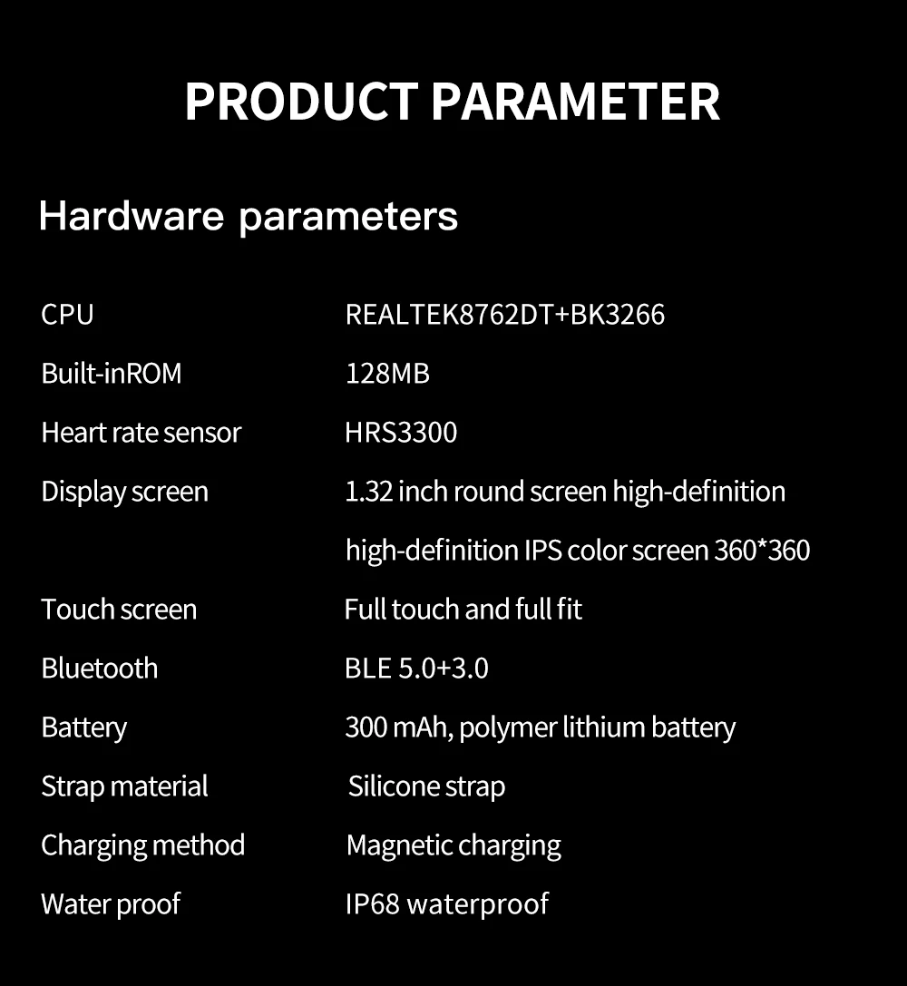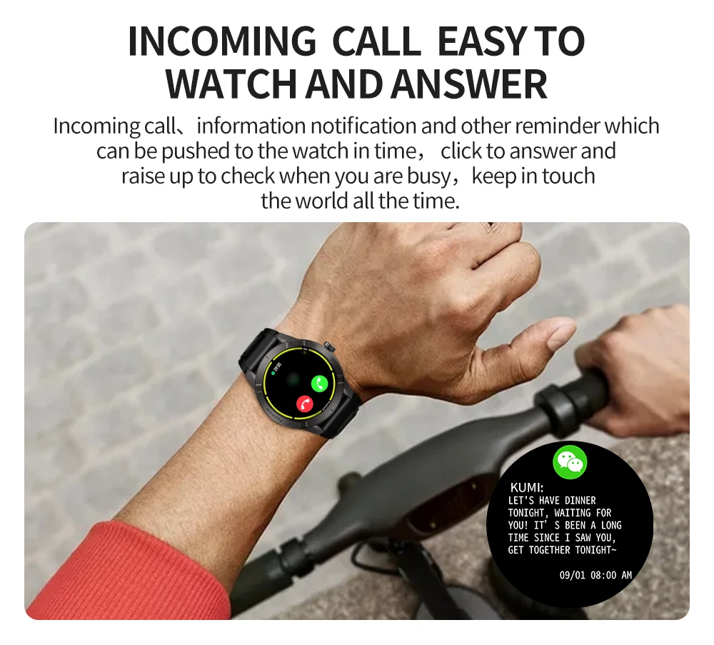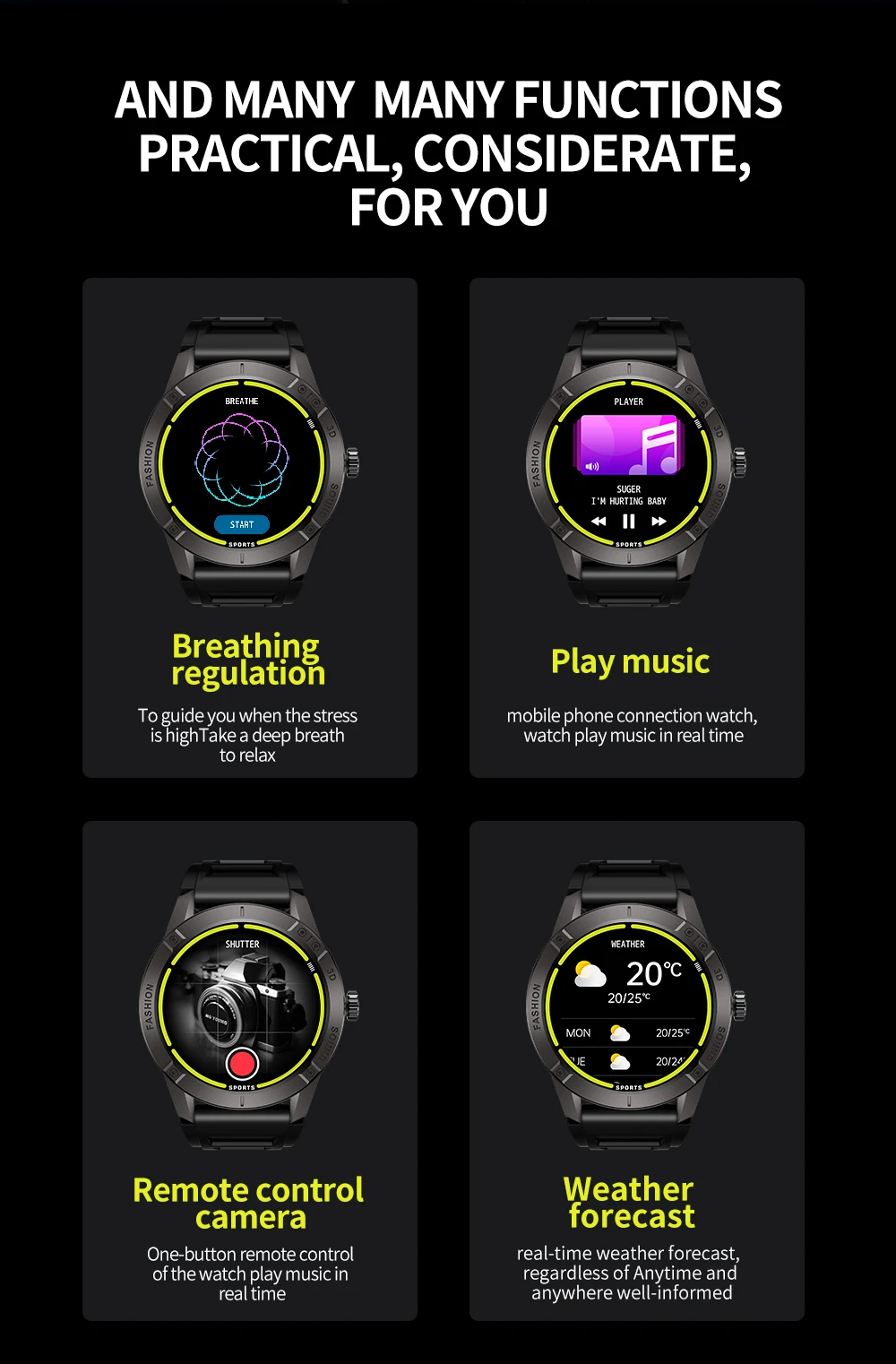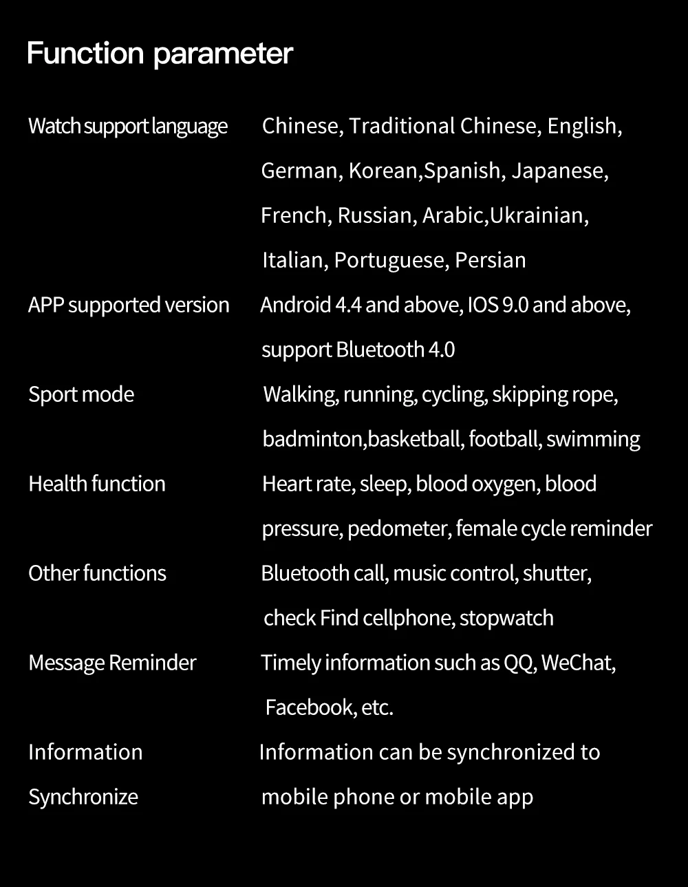 Everyday smart features: smart notifications (incoming calls, text messages, Gmail and smartphone app notifications), weather, Bluetooth Call, control smartphone music and camera, find my watch, do not disturb Mode.