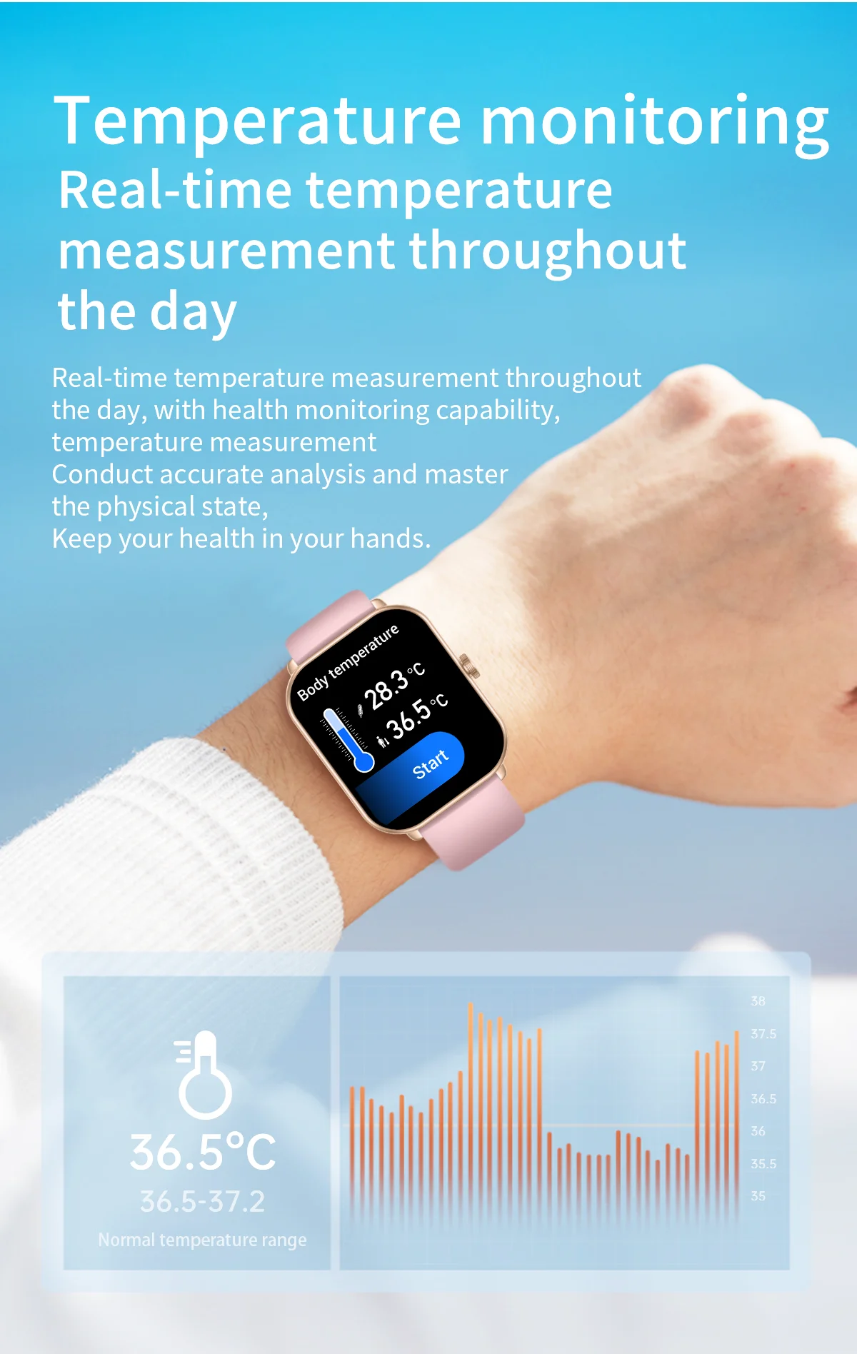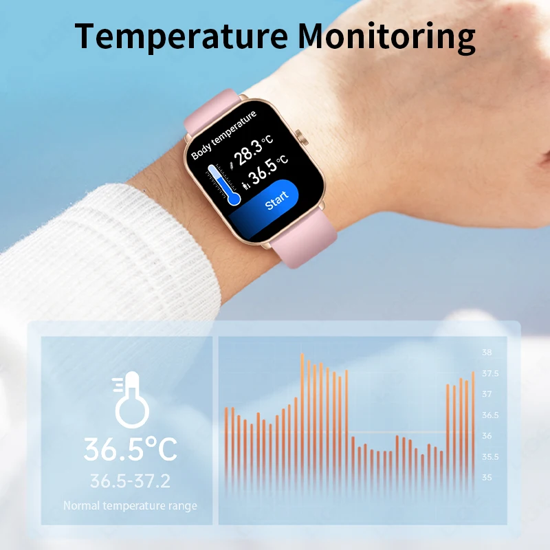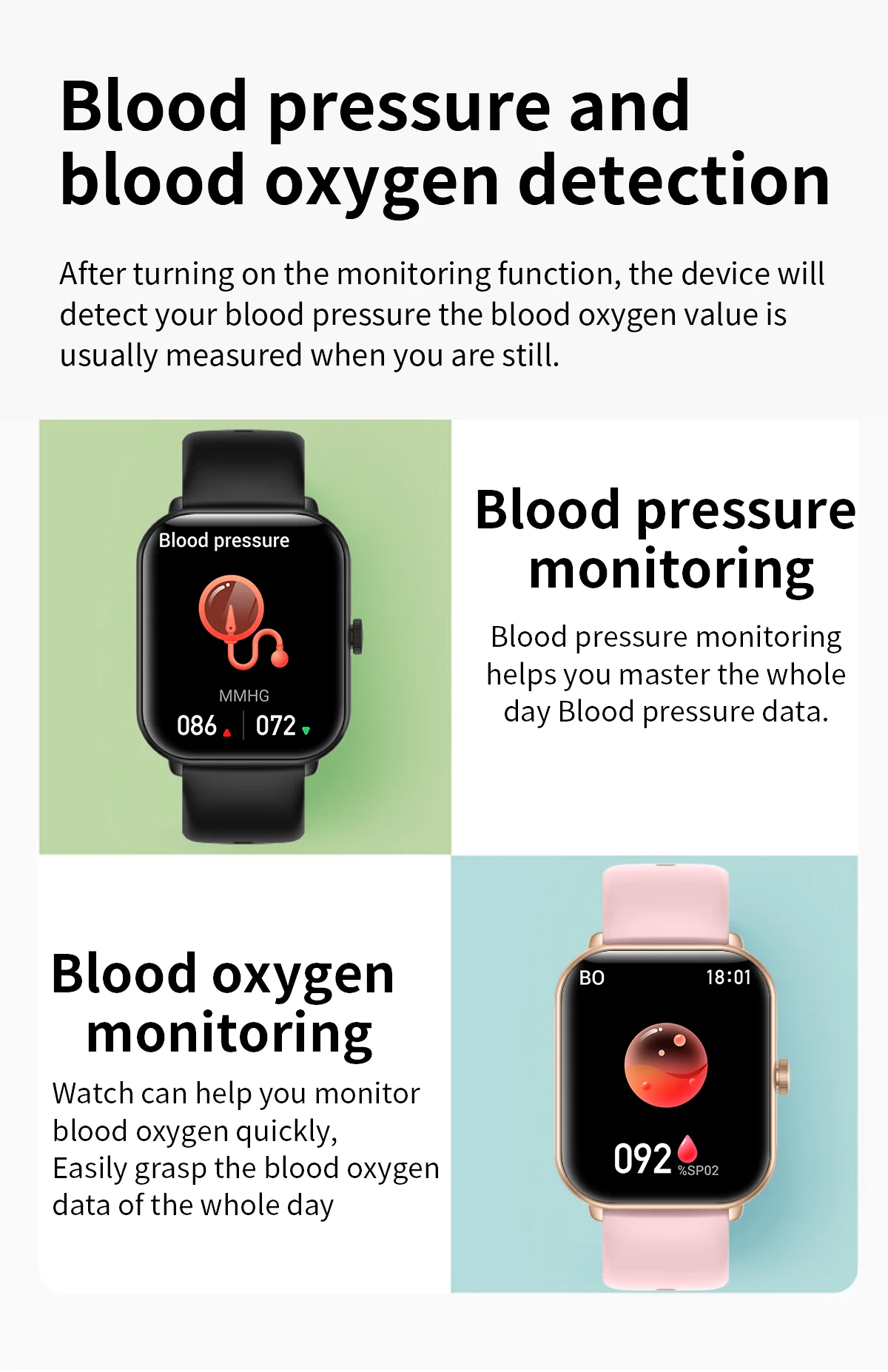 Health monitoring: real-time heart rate measurement (dynamic, static), blood pressure measurement (scheduled blood pressure measurement can be set), blood oxygen measurement, body temperature