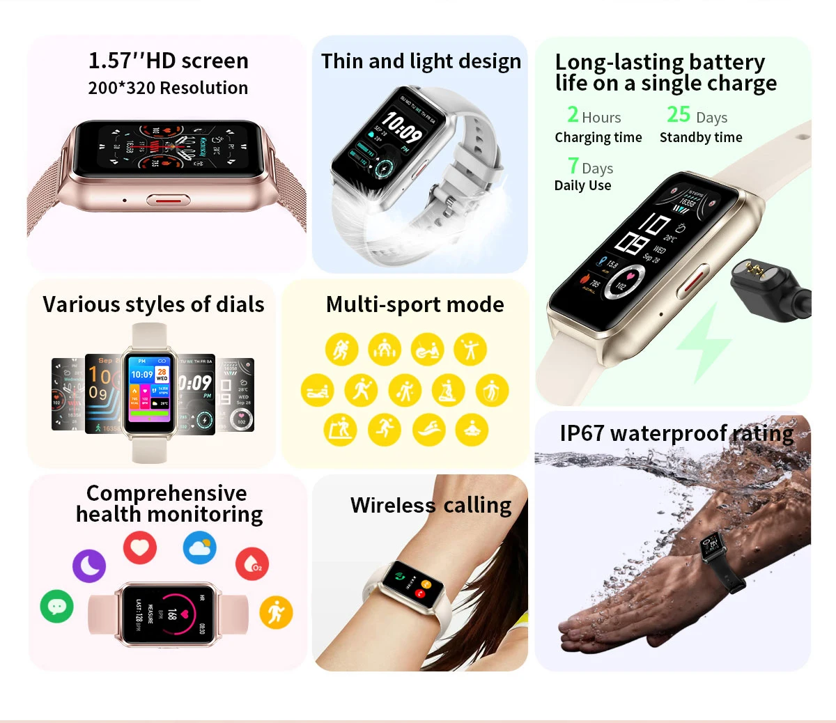 Answer, make calls, switch between multiple dials, self-editing dials, language settings, call history, dial, contacts, call reminder, time display, timer (stopwatch, countdown), find bracelet, find mobile phone, weather, photo control , music control, turn your wrist to brighten the screen, time format switching, stress reduction sleep aid, flashlight, date and time, brightness adjustment, do not disturb mode, vibration switch, call Bluetooth switch, voice assistant, OTA, blood oxygen detection, blood pressure detection, Heart rate detection, sleep detection, sedentary reminder, menstrual cycle reminder, drinking water reminder, dial selection, all-day heart rate, QR code download, factory reset, pedometer, calorie display, distance.