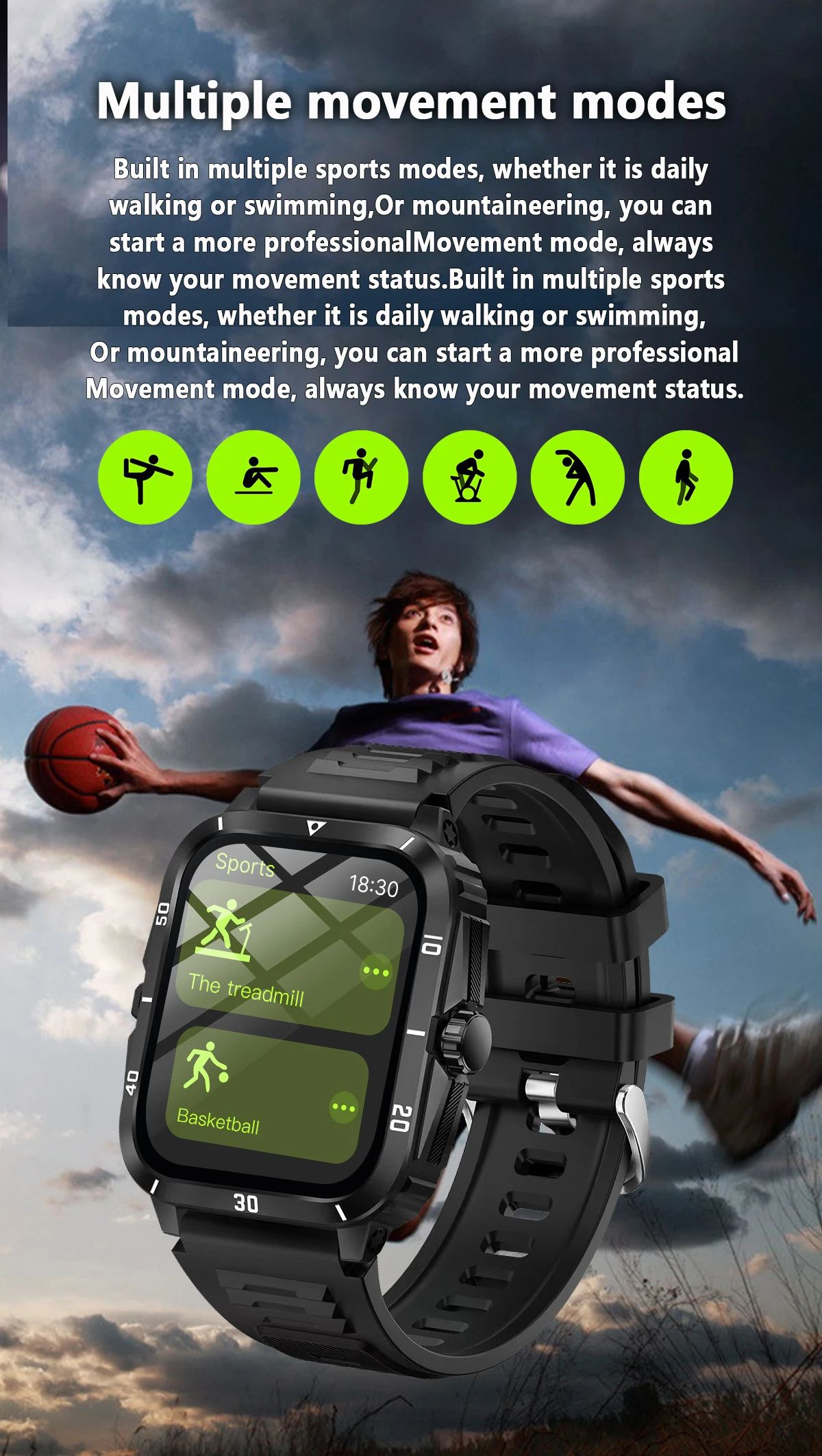 2.01” HD Big Screen Smartwatch:Features a Large Screen with IPS HD Touchscreen.With a high resolution of 240*296 for smooth operation and a clearer,brighter and more detailed visual experience.Big screen smart watch allows you to see the data of your sports smartwatch clearly during use.