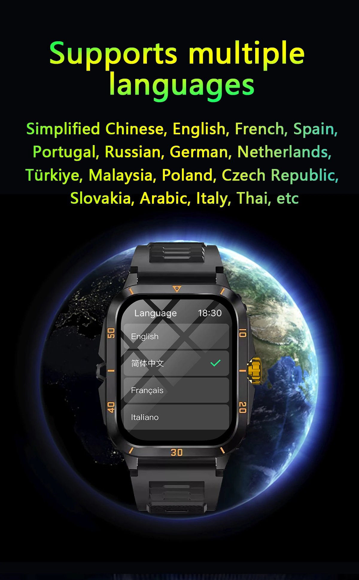 Watch language: English, Chinese, Dutch, Russian, French, German, Portuguese, Spanish, Turkish, Polish, Malay
