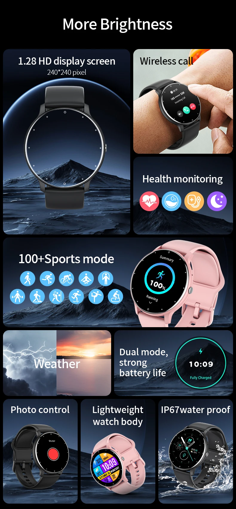 Side button, multiple interface design on the APP side, user-selected use, exercise, sleep detection, blood pressure, incoming call/message content push, message reminder, alarm clock, shake or click to take a picture, raise the wrist to brighten the screen, switch the system, and remind you to sit for a long time , Stopwatch, look up the phone, adjust the brightness of the bracelet, and adjust the duration of the bracelet’s bright screen.