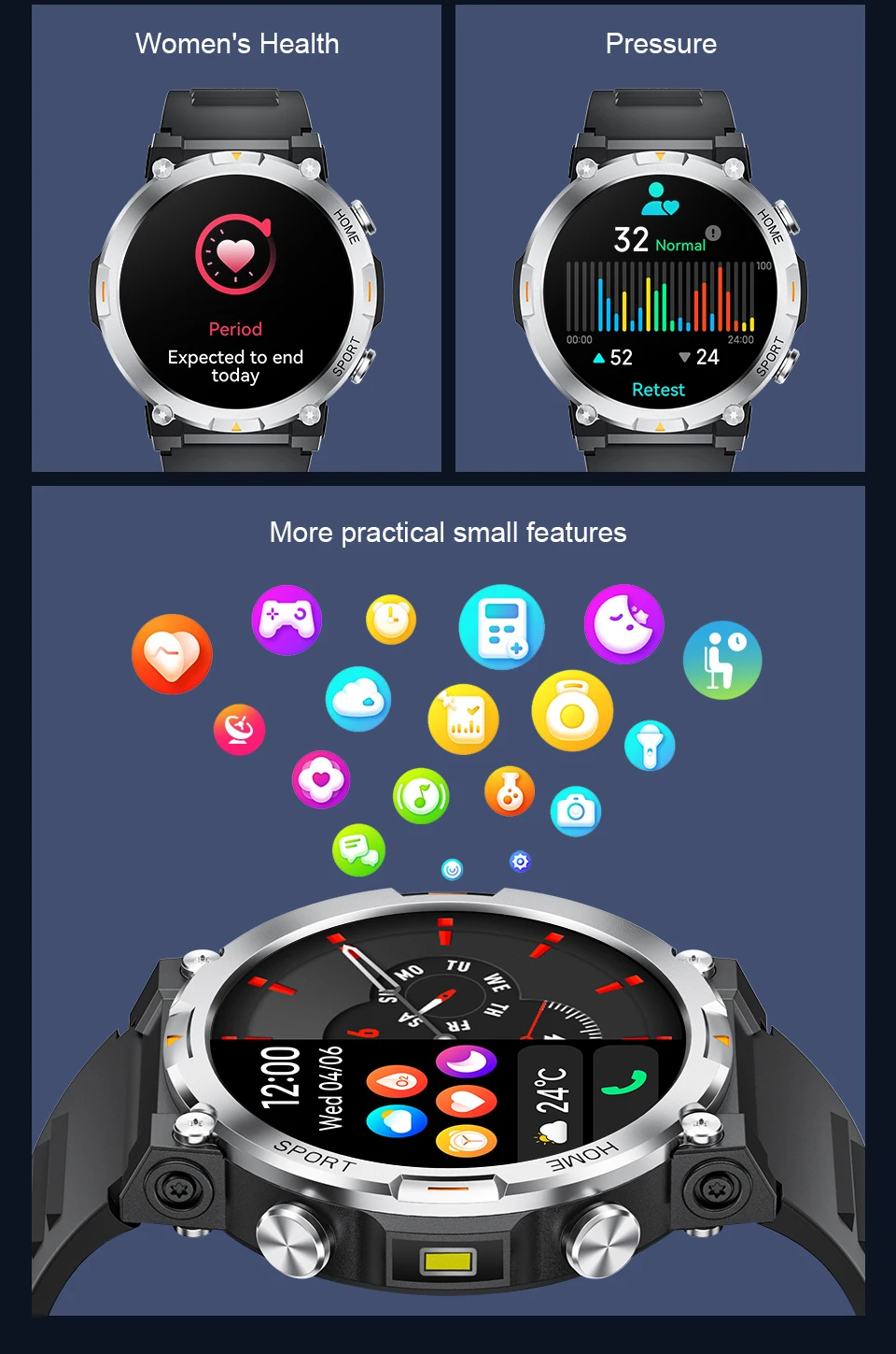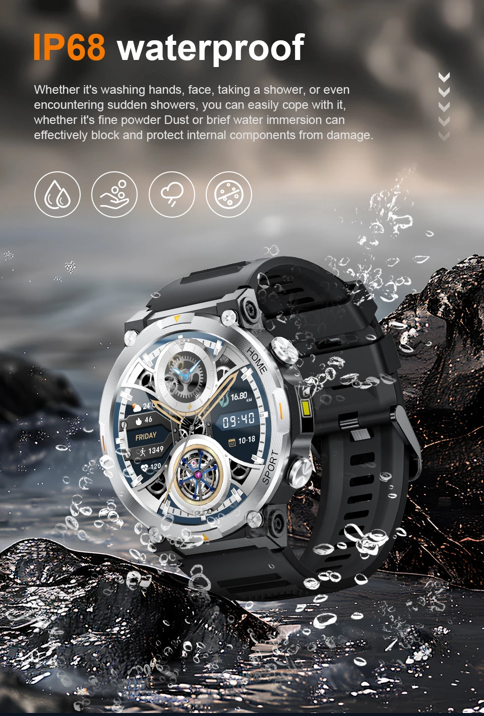 Flashlight on the wrist:the smart watch is equipped with a small flashlight on the side, adding practical function for your outdoor adventure and helping you light the road in the wilderness.