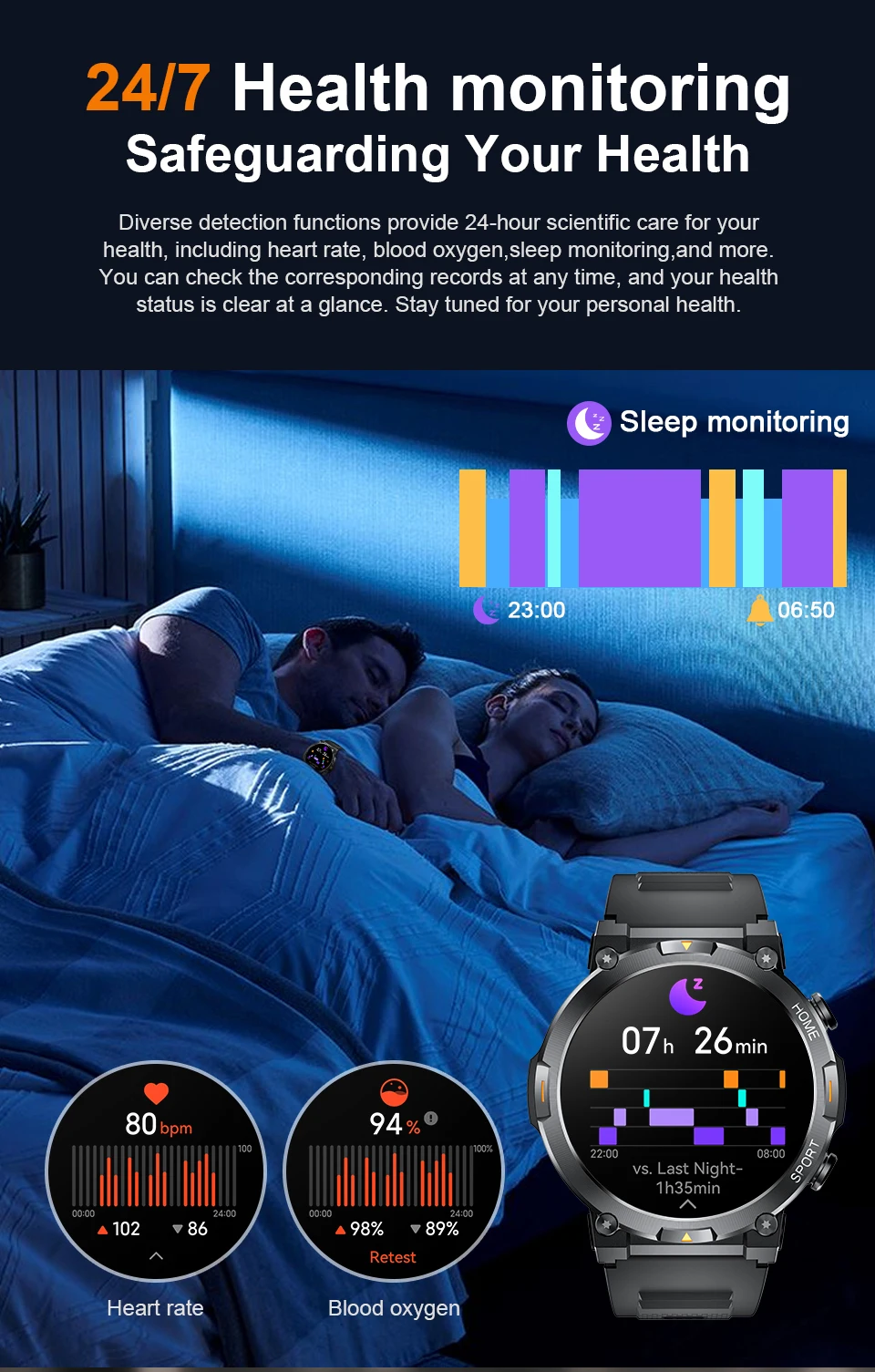 Health monitoring:fitness tracker watch provides 24/7 heart rate and blood oxygen monitoring to help you better understand your body condition. Besides, the men smart watch also has sleep tracker function to analyze your sleep quality.