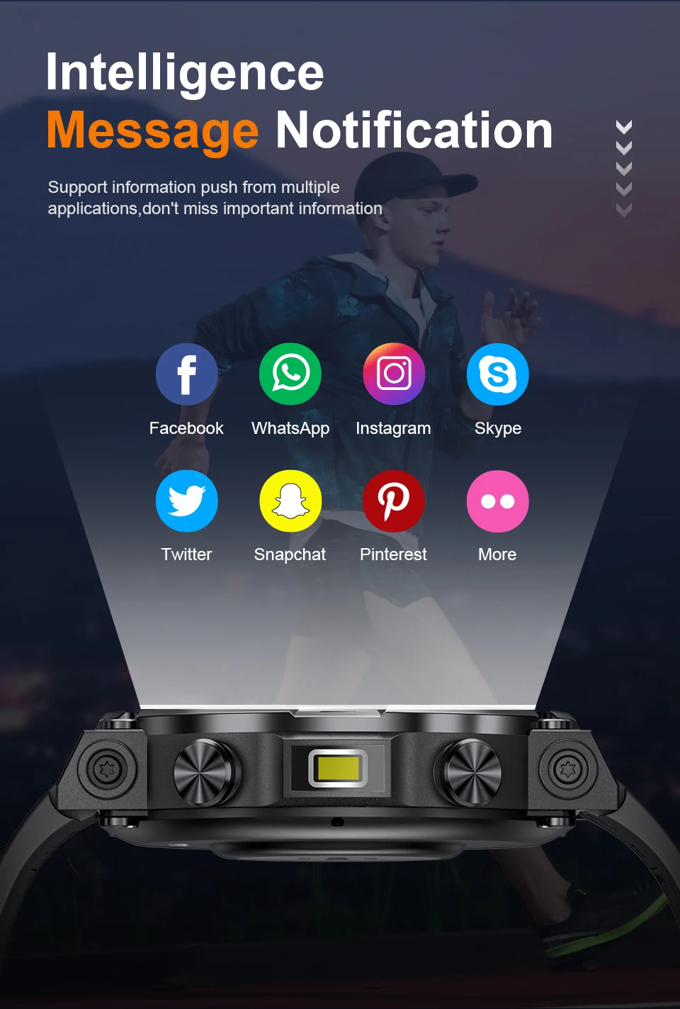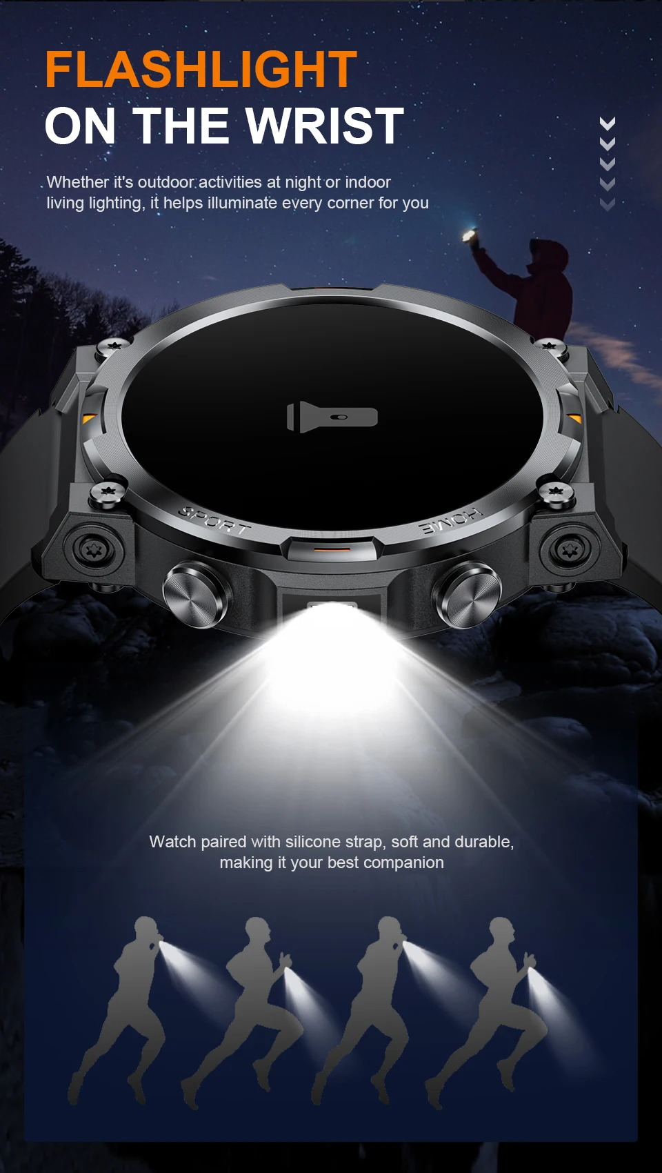 Flashlight on the wrist:the smart watch is equipped with a small flashlight on the side, adding practical function for your outdoor adventure and helping you light the road in the wilderness.