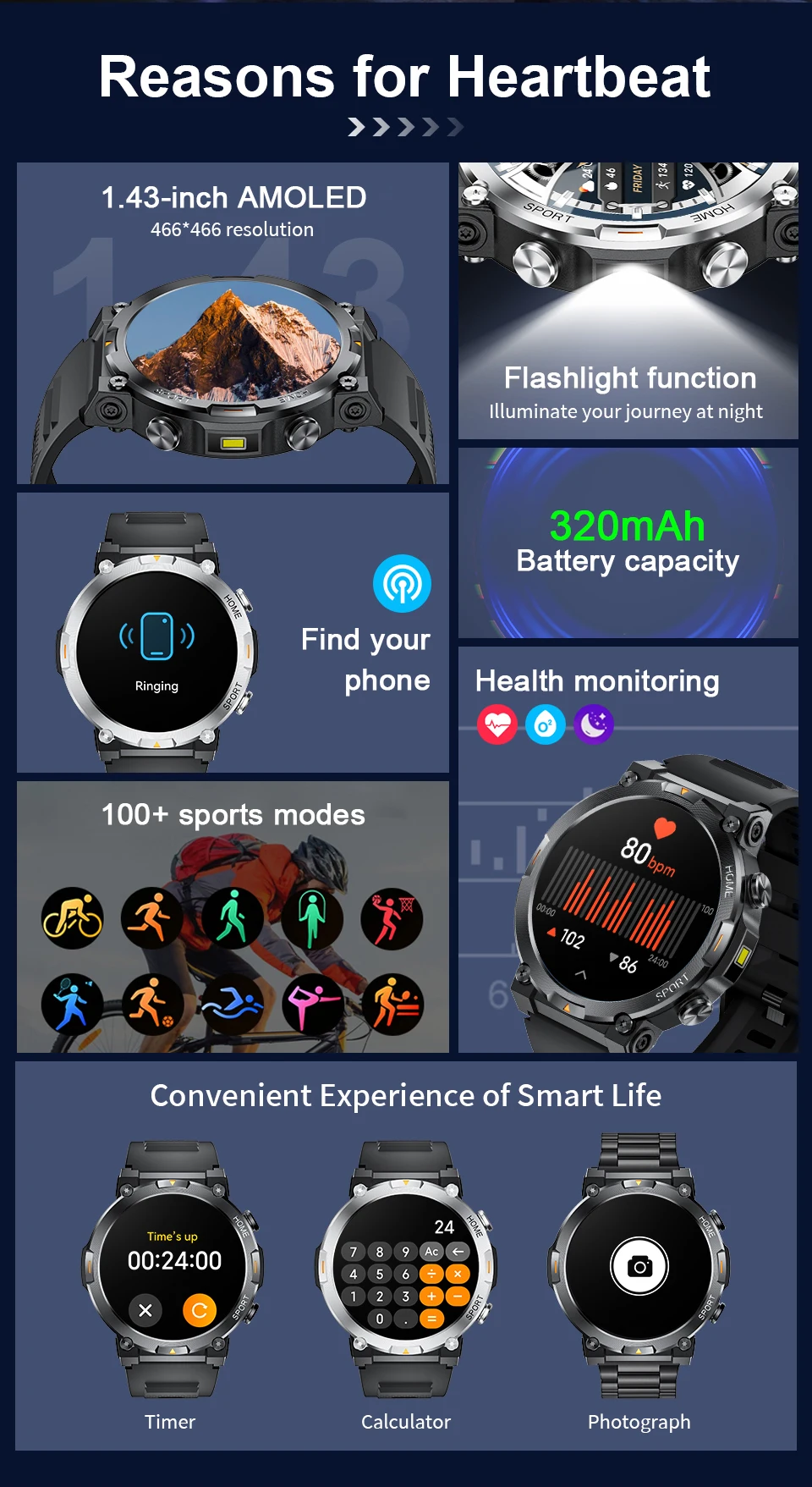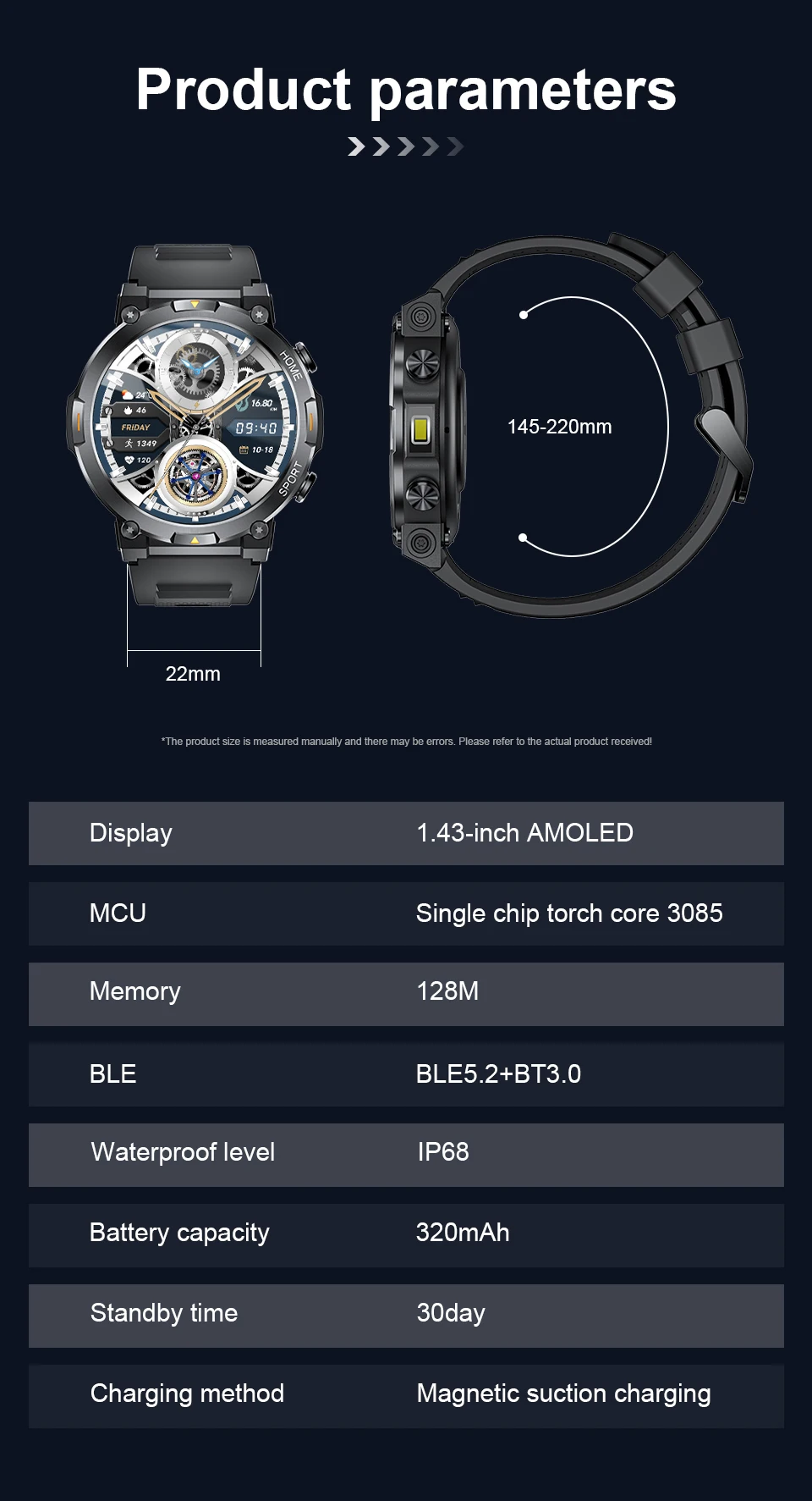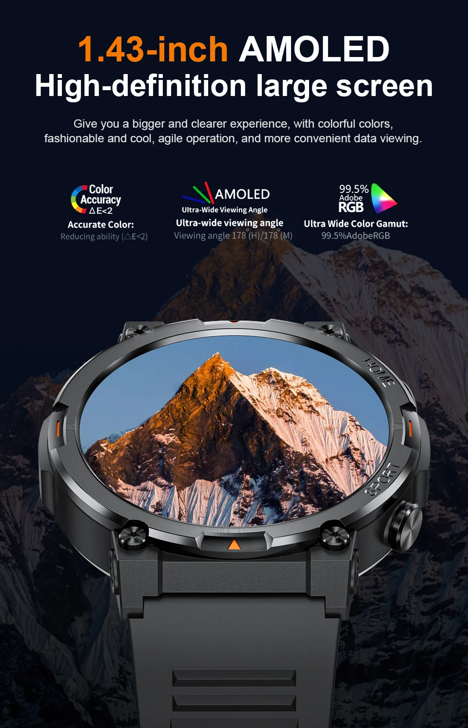 - Professional Sports Smart Watch: 1.43 inch AMOLED HD display screen Outdoor sports watch