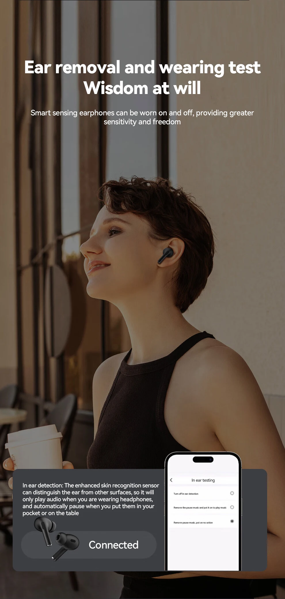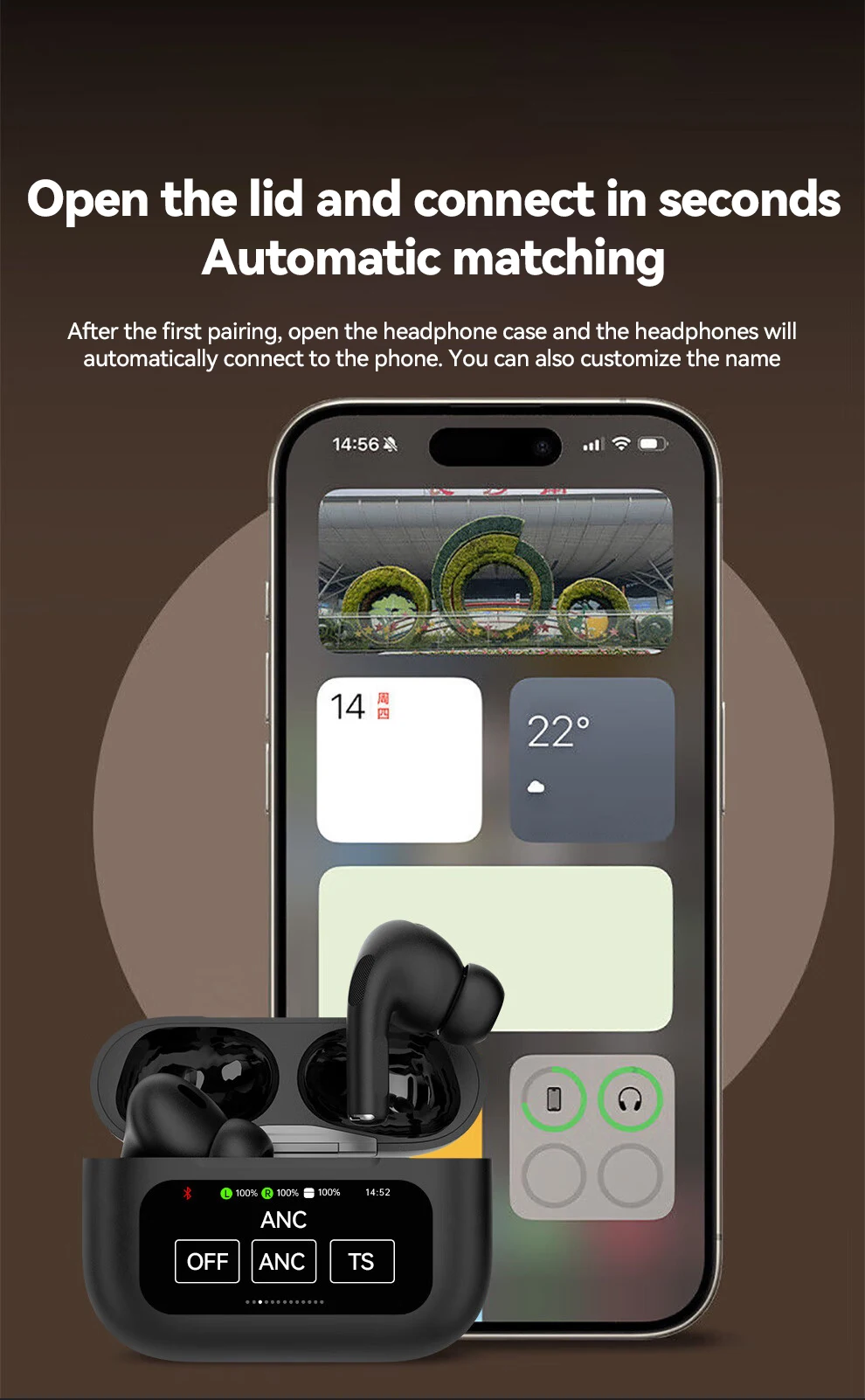 Control the earbuds’ settings, manage calls and playback, control your audio setting and battery level and set your alarm without taking out your phone, through the screen of the charging case. Enjoy a truly seamless experience