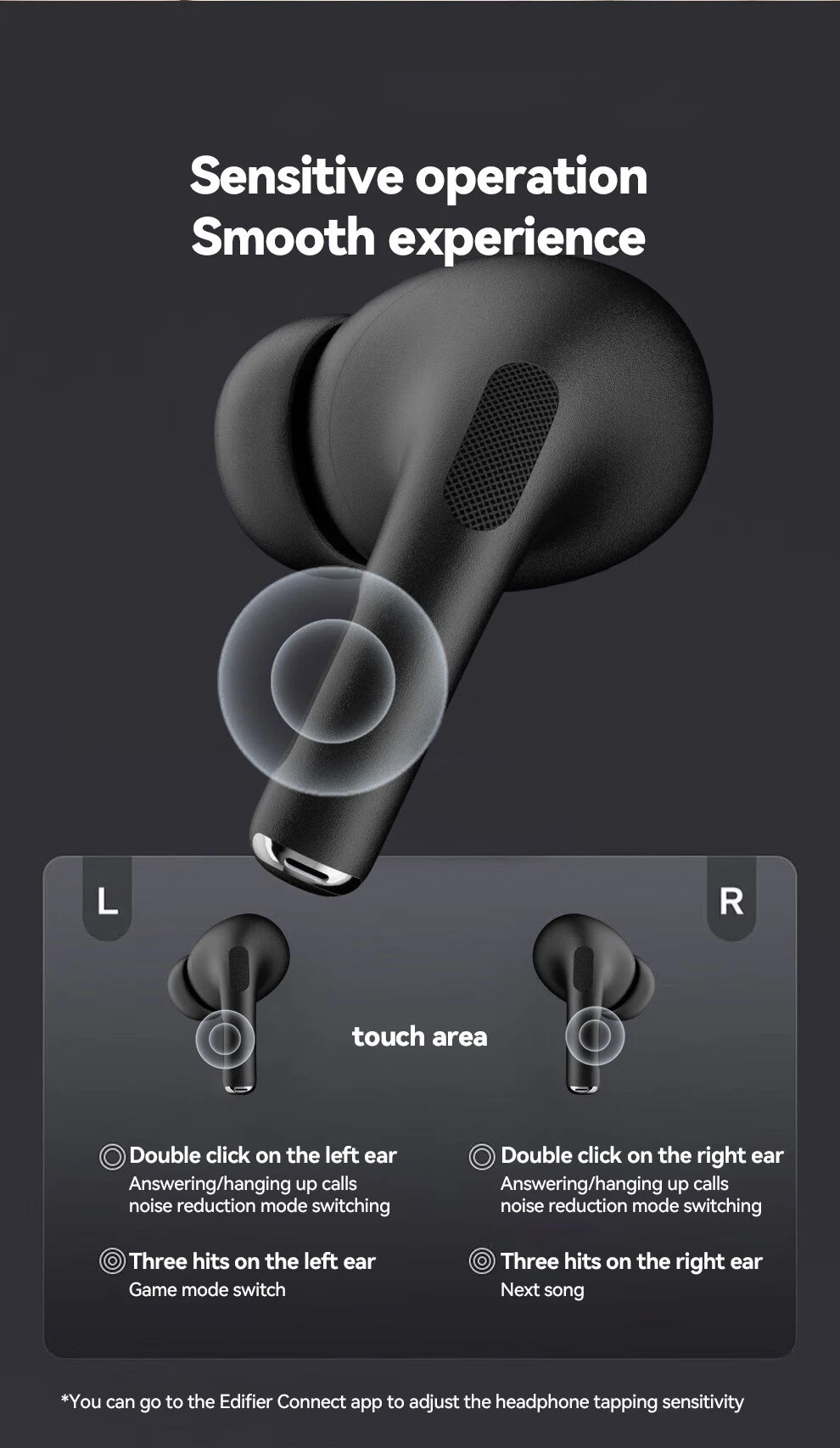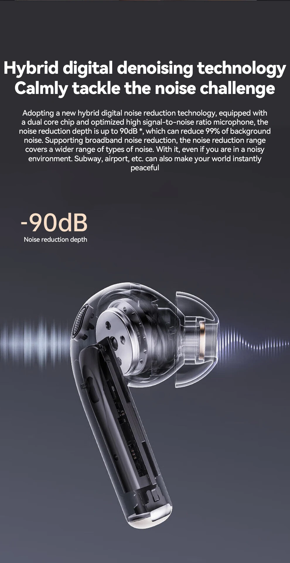 ANC-Active Noise Cancelling Dual Noise Reduction (ANC Active Noise Cancelling + ENC Environmental Noise Cancelling). So that a noisy environment has a quiet world,listen to wonderful singing, and has clear telephone communication.