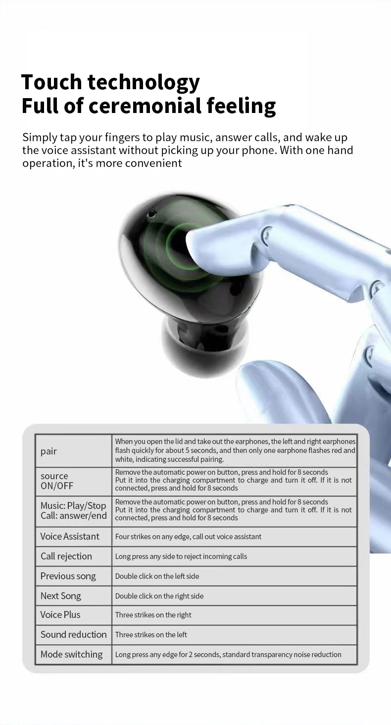 Multi-function touch panel on each earphone helps to play, pause, adjust volume, answer, end calls, activate siri and google assistant more convenient.
