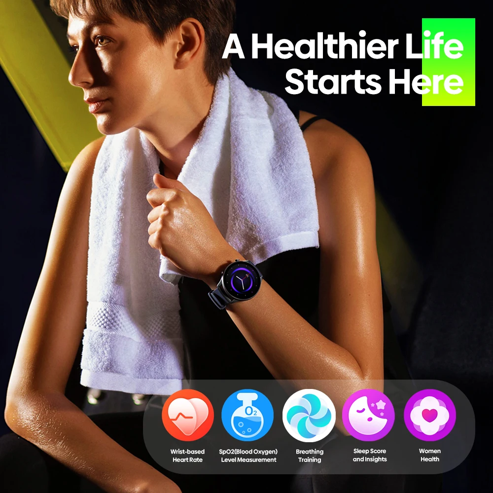 Health Monitoring: Wrist-based Heart Rate (Constant, Every Minute), Daily Resting Heart Rate, SpO2(Blood Oxygen) Level Measurement, Blood Pressure, Breathing training cycle Tracking, Sleep Score and Insights, and Calorie Burn Tracking.