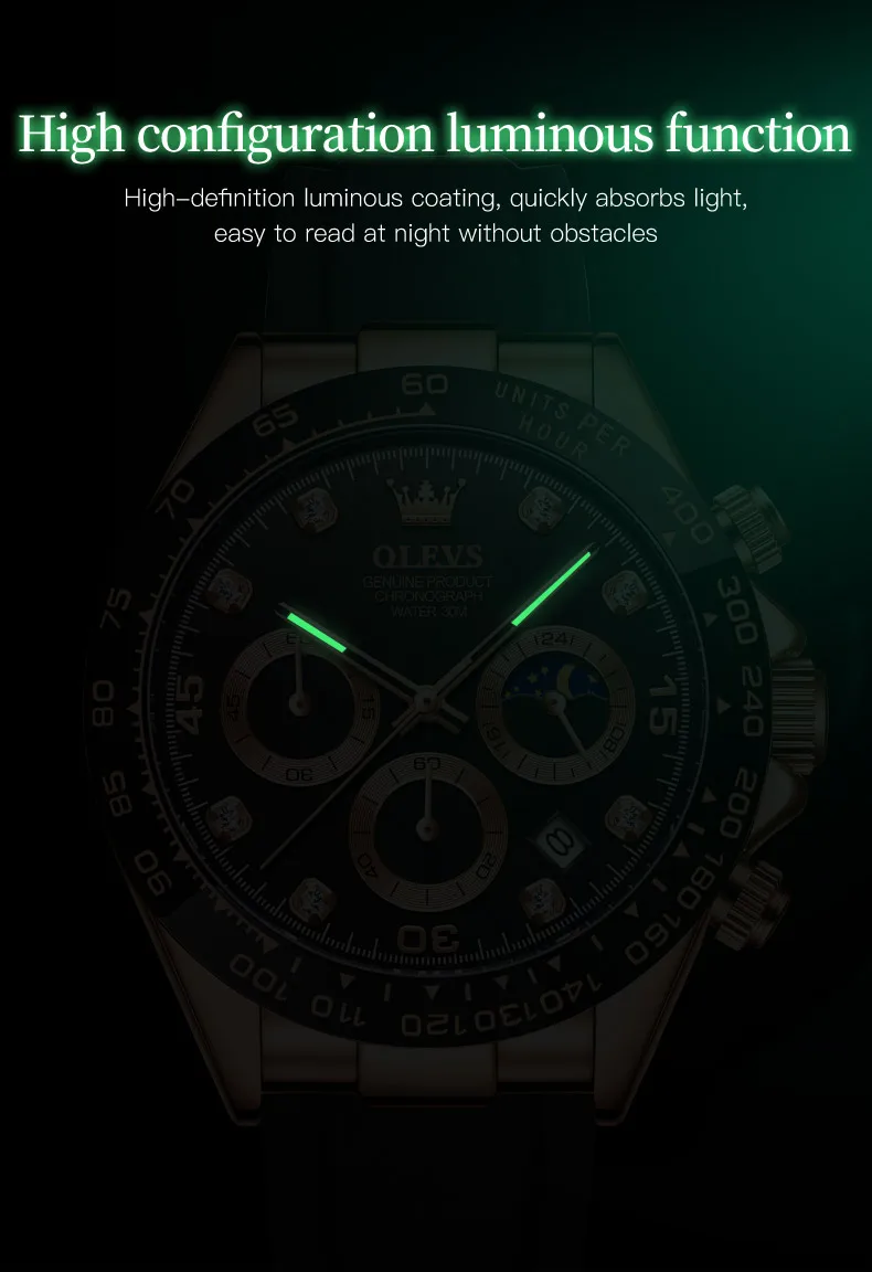 - Feature: STOP WATCH,Luminous,Auto Date,Moon Phase,Water Resistant