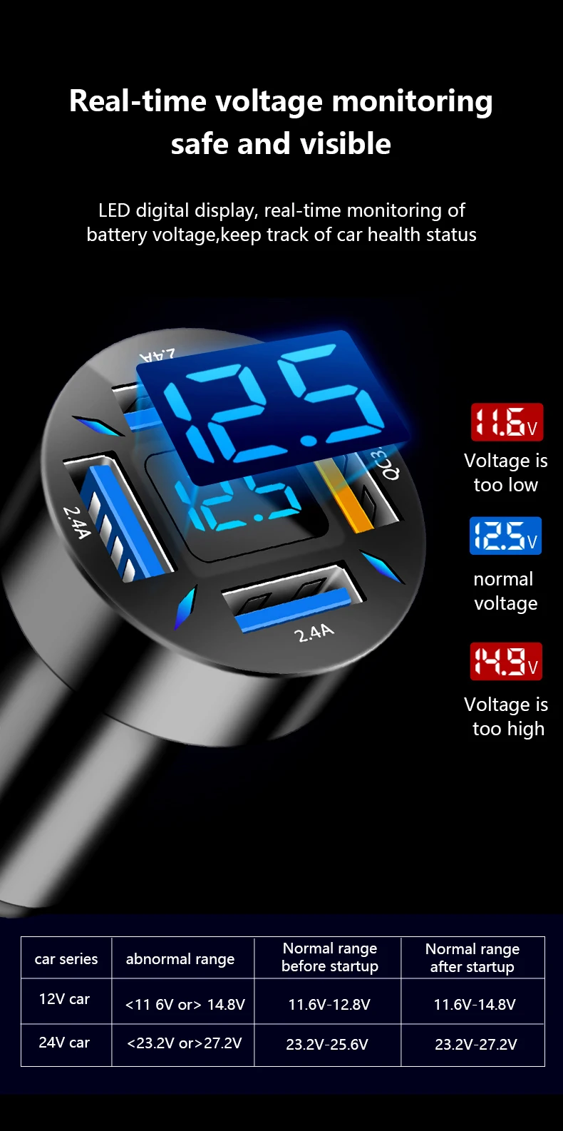 1. LED display monitors the car battery voltage in real time