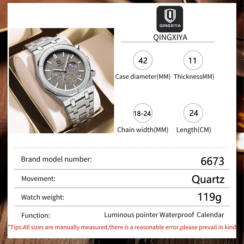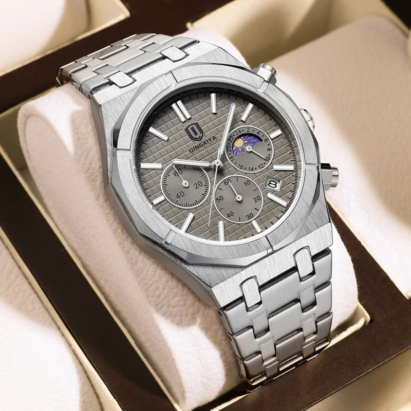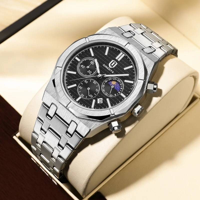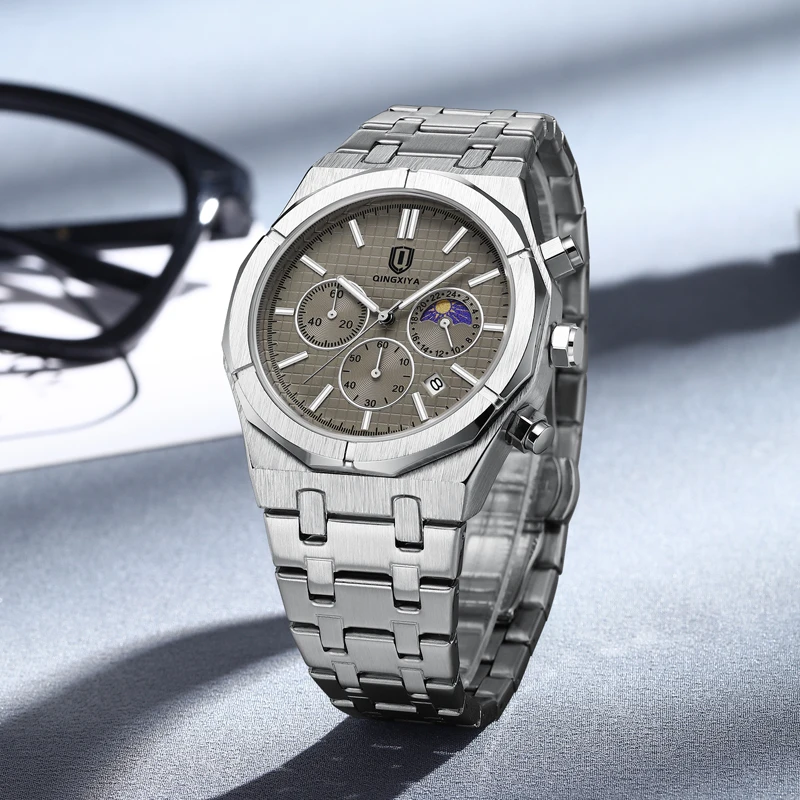 QINGXIYA 2024 New Fashion Chronograph Quartz Watch Men Stainless Steel Waterproof Luminous Date Luxury Moon Phase Watches Mens