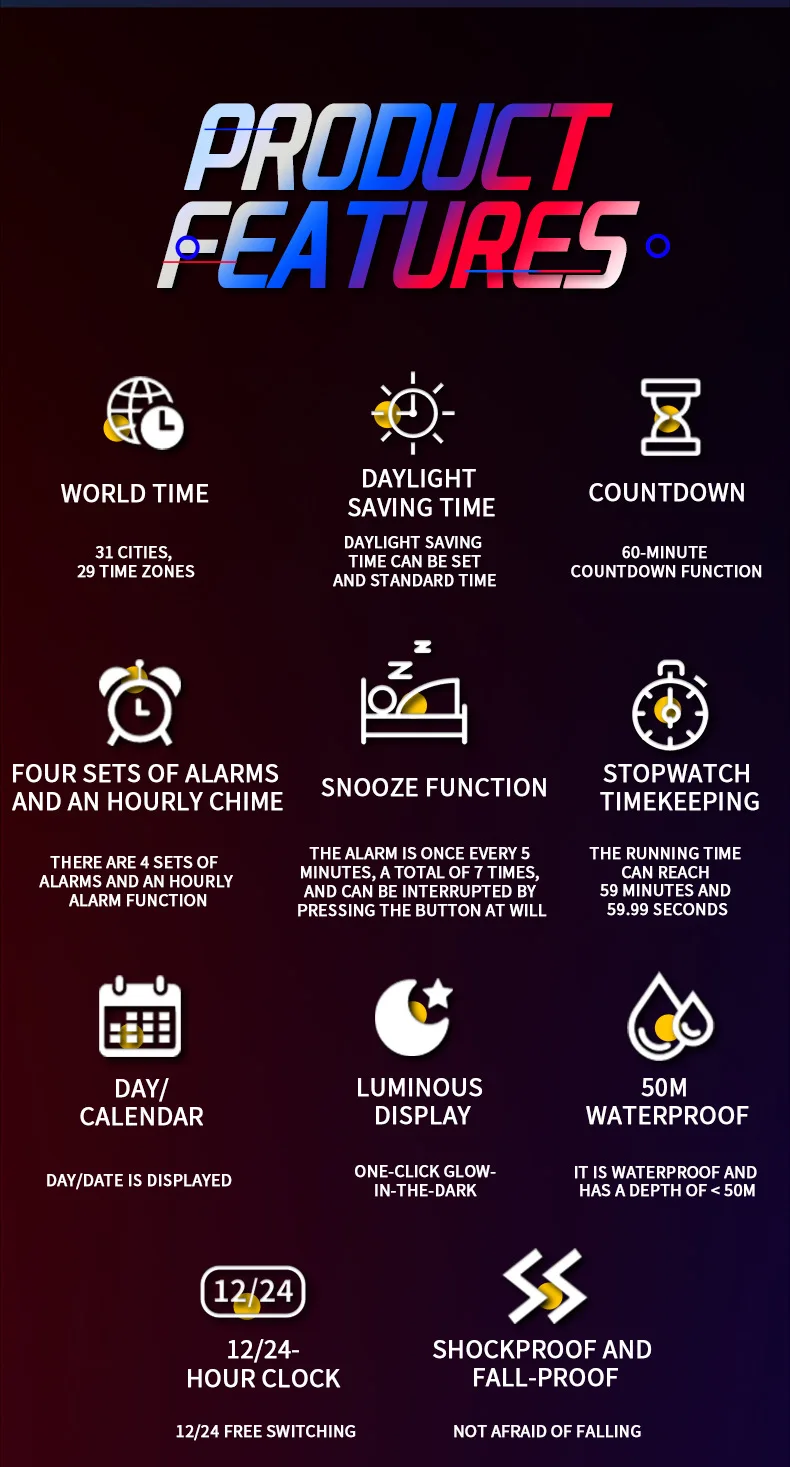 - Feature: Luminous,Sleep monitoring,LED display,Complete Calendar,Multiple Time Zone,Alarm,Week Display
