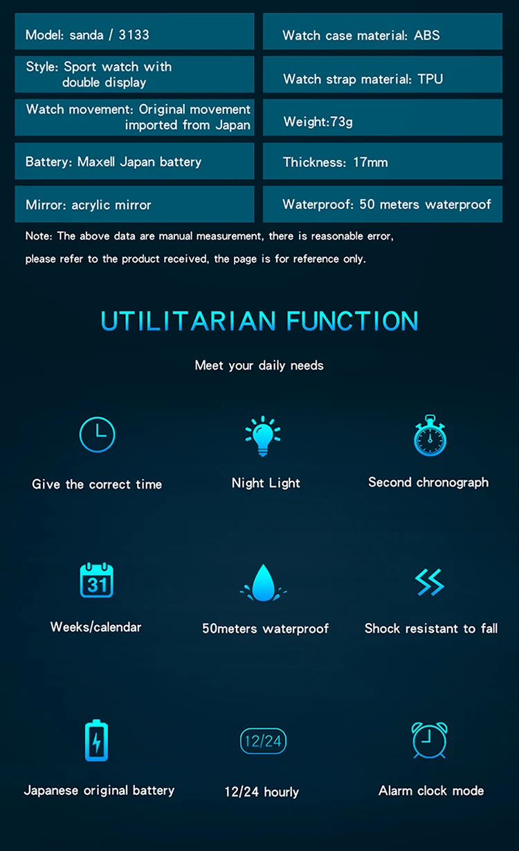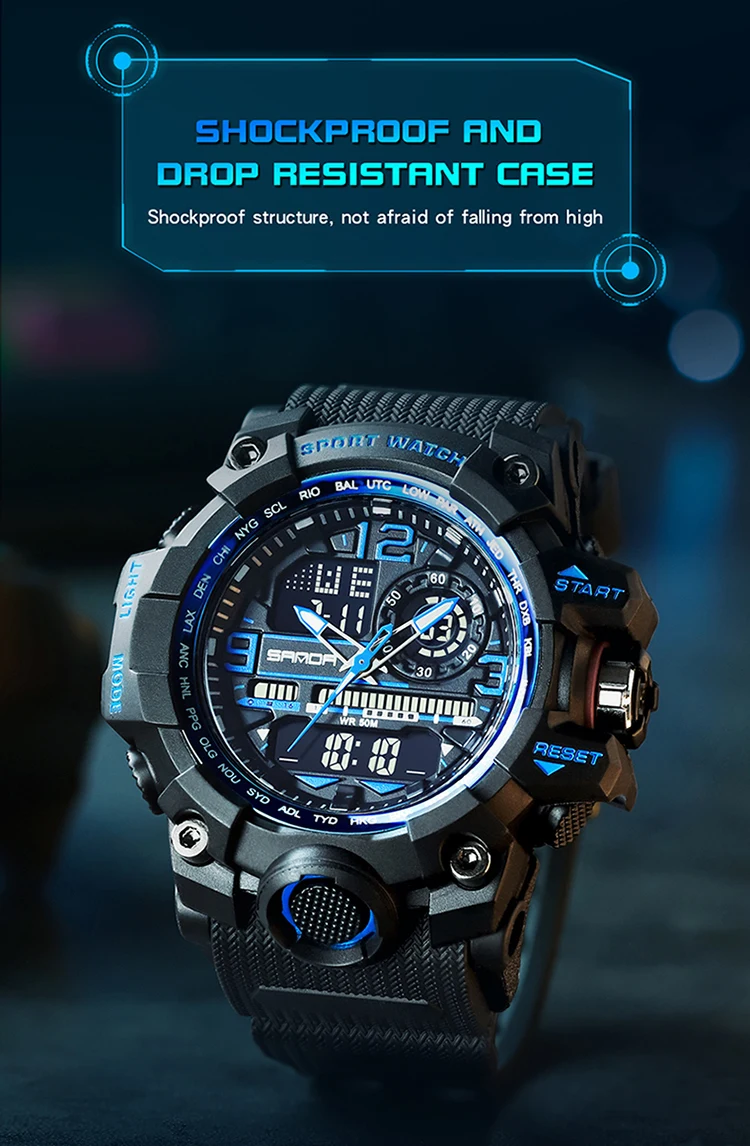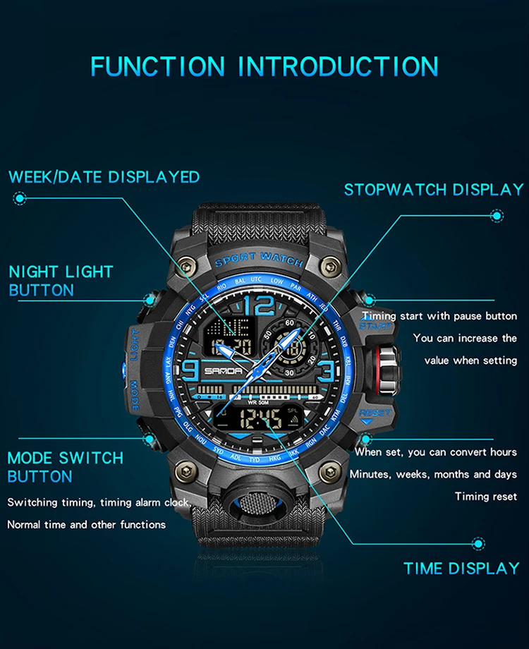 - Feature: STOP WATCH,Back Light,Shock Resistant,LED display,Repeater,Luminous,Auto Date,Chronograph,DIVER,Multiple Time Zone,Water Resistant,Alarm,swim,Week Display
