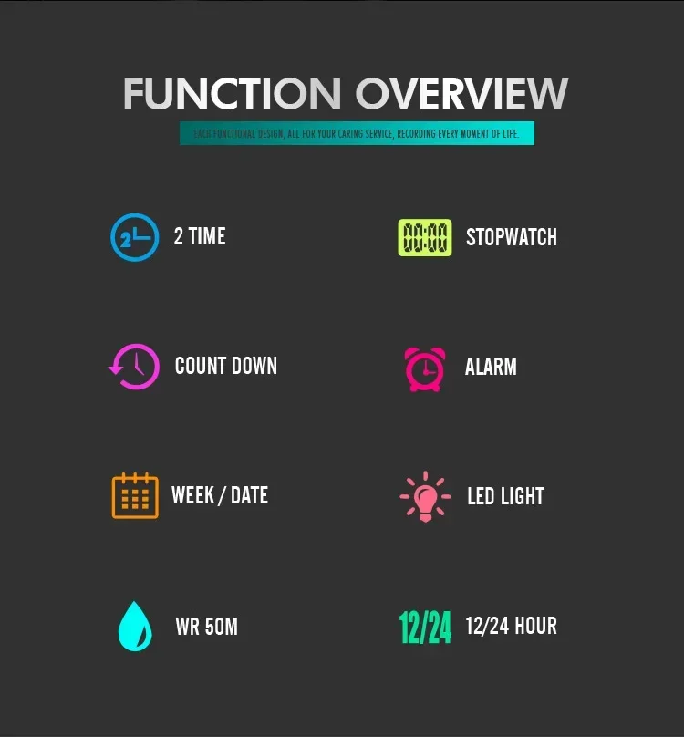 8.Function:2time, chrono,alarm,week,date,LED light,12/24 hour clock,countdown