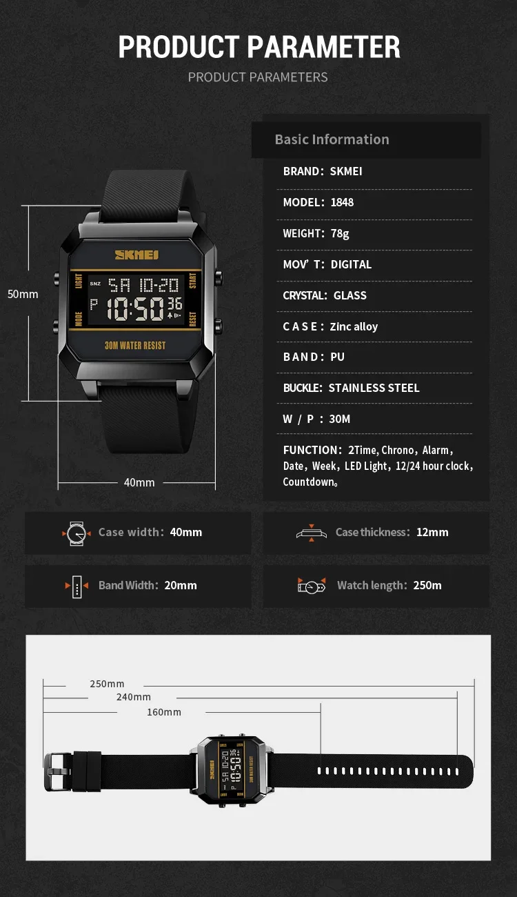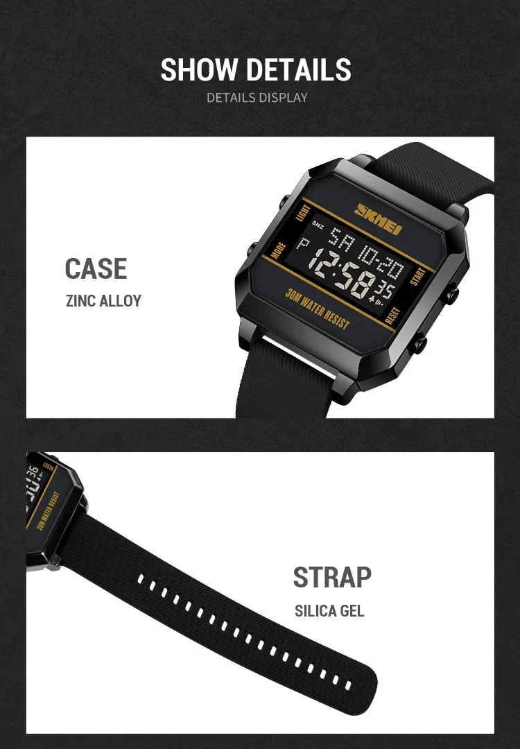 - Feature: STOP WATCH,Back Light,Shock Resistant,LED display,Luminous,Auto Date,Chronograph,Complete Calendar,Water Resistant,Alarm,Week Display