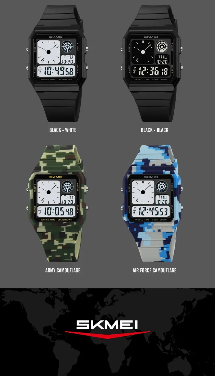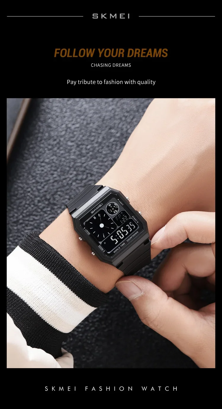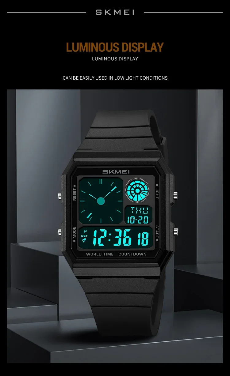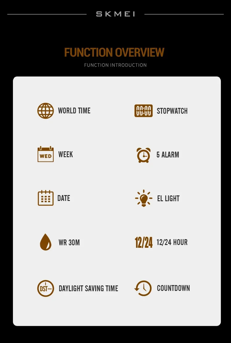 - Feature 1: World time, Chrono, 5 Alarm,Date, Week, EL Light,