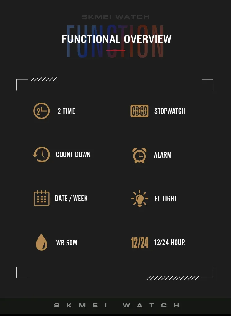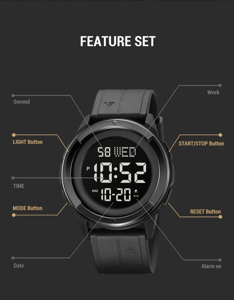 - Feature: STOP WATCH,Back Light,LED display,Auto Date,Chronograph,Water Resistant,Alarm,Week Display