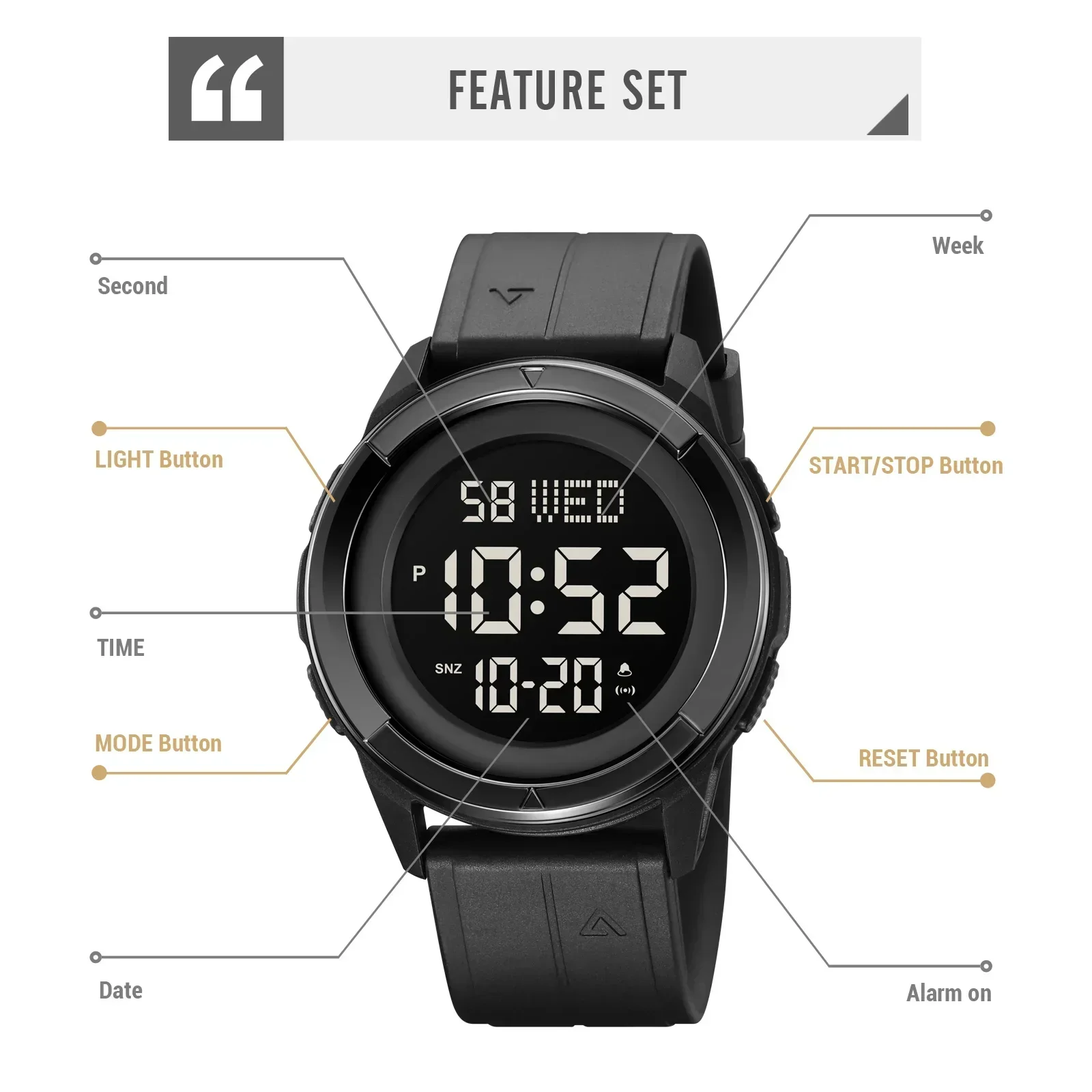 - Feature: STOP WATCH,Back Light,LED display,Auto Date,Chronograph,Water Resistant,Alarm,Week Display
