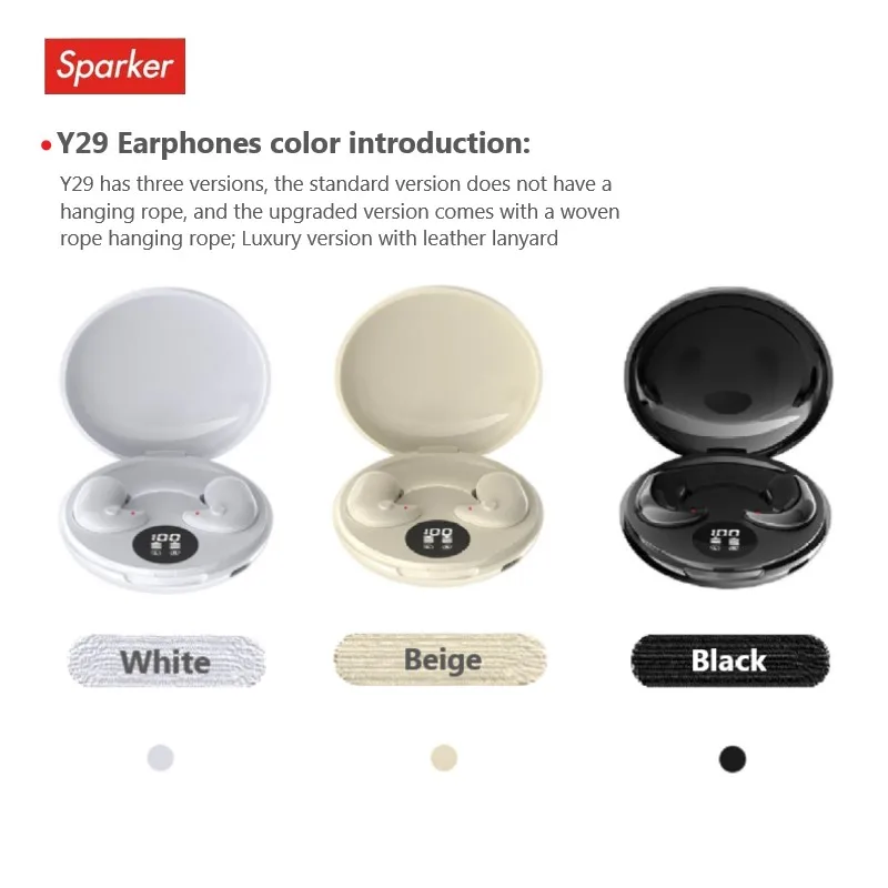 There are three versions of Y29 sleep Bluetooth earphones, the standard version does not have a lanyard, the upgraded version comes with a braided lanyard, and the luxury version comes with a leather lanyard. The specific configurations of the three versions are also different, reflected in battery life and functionality. Please refer to the purchase property map for specific details.