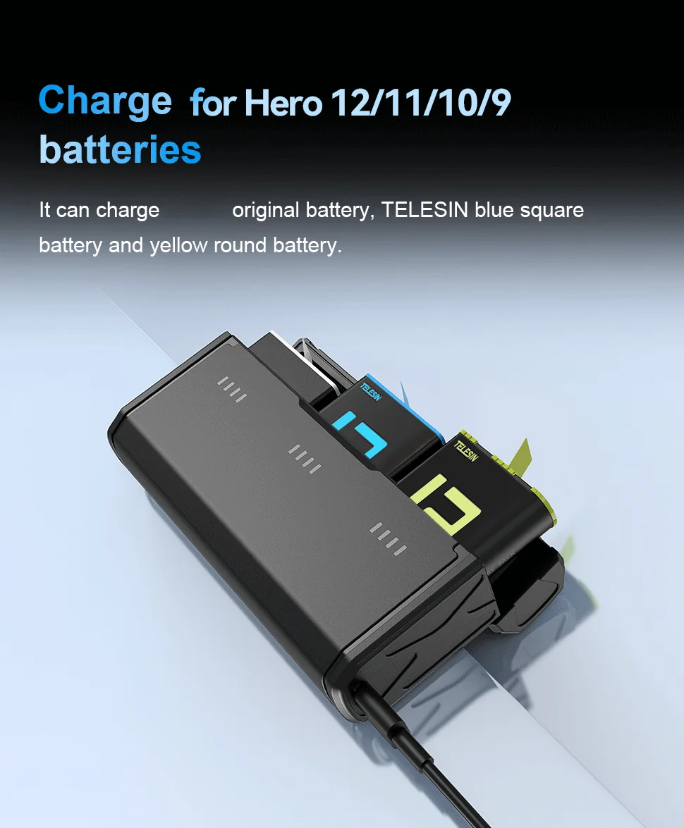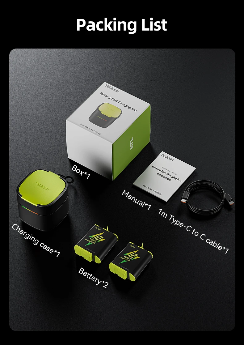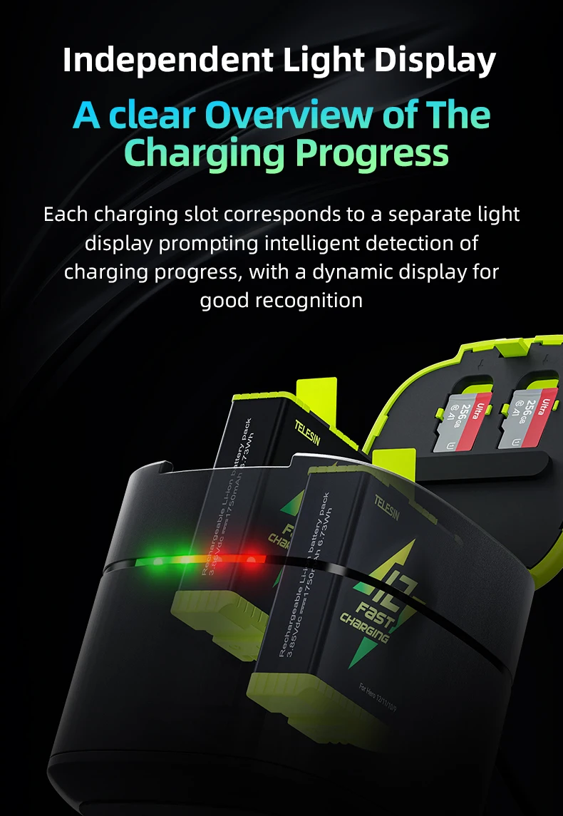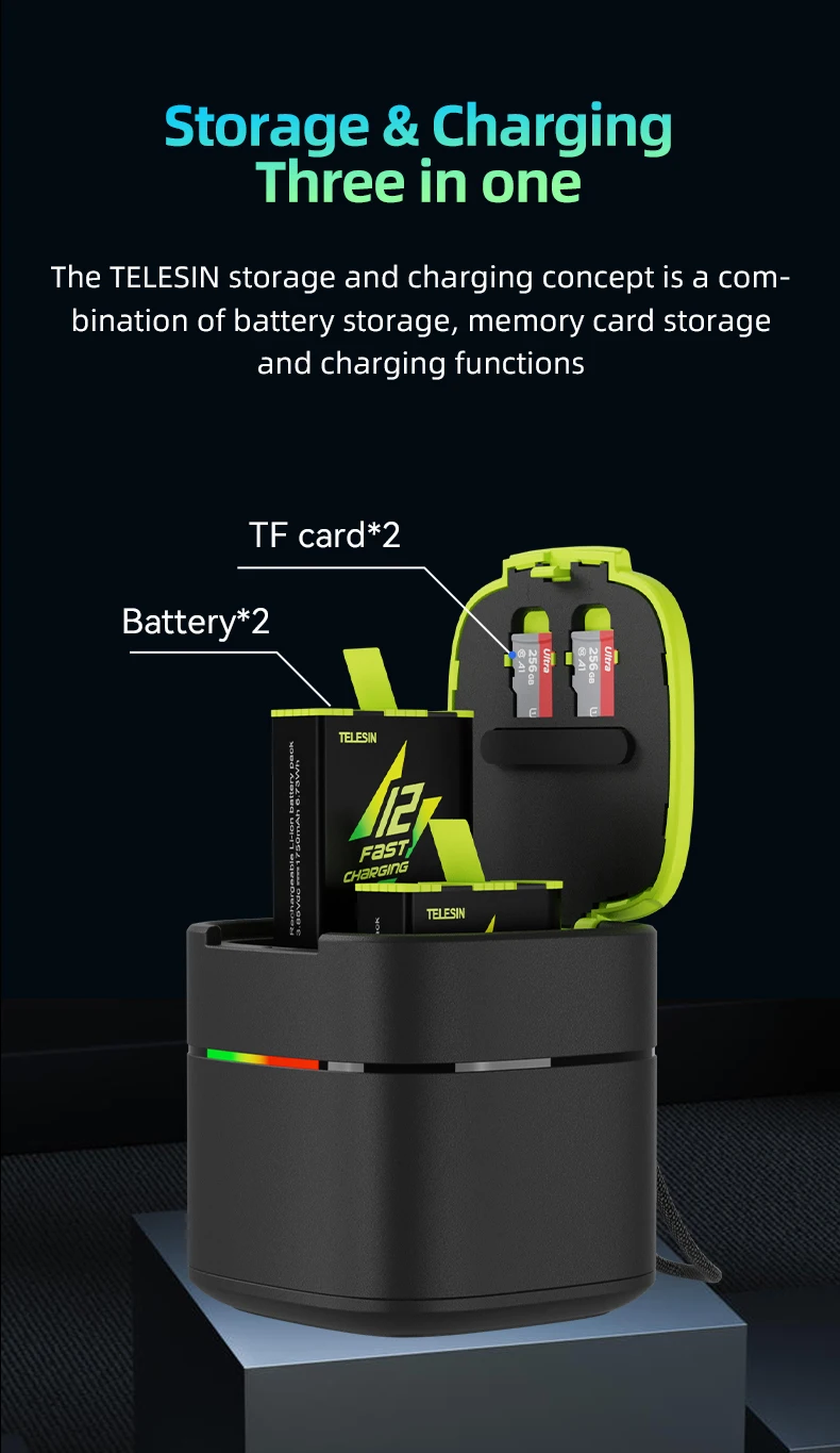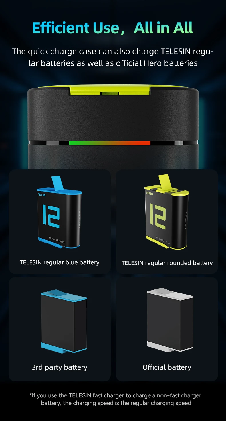4. The charging box is compatible with GoPro original batteries, third-party batteries, and TELESIN fast-charging batteries. Still, only with TELESIN fast-charging batteries or stamina batteries, fast charging can be achieved.