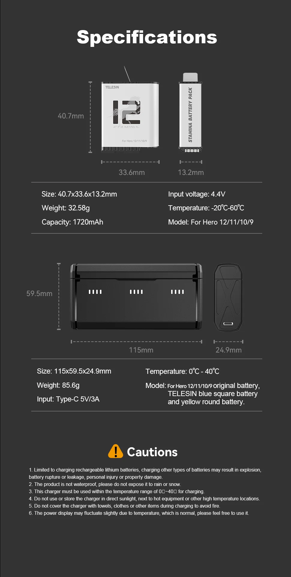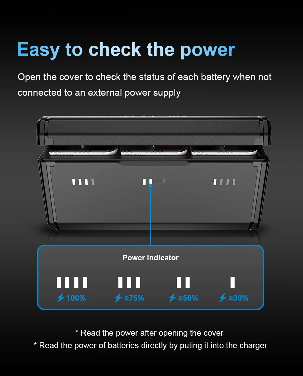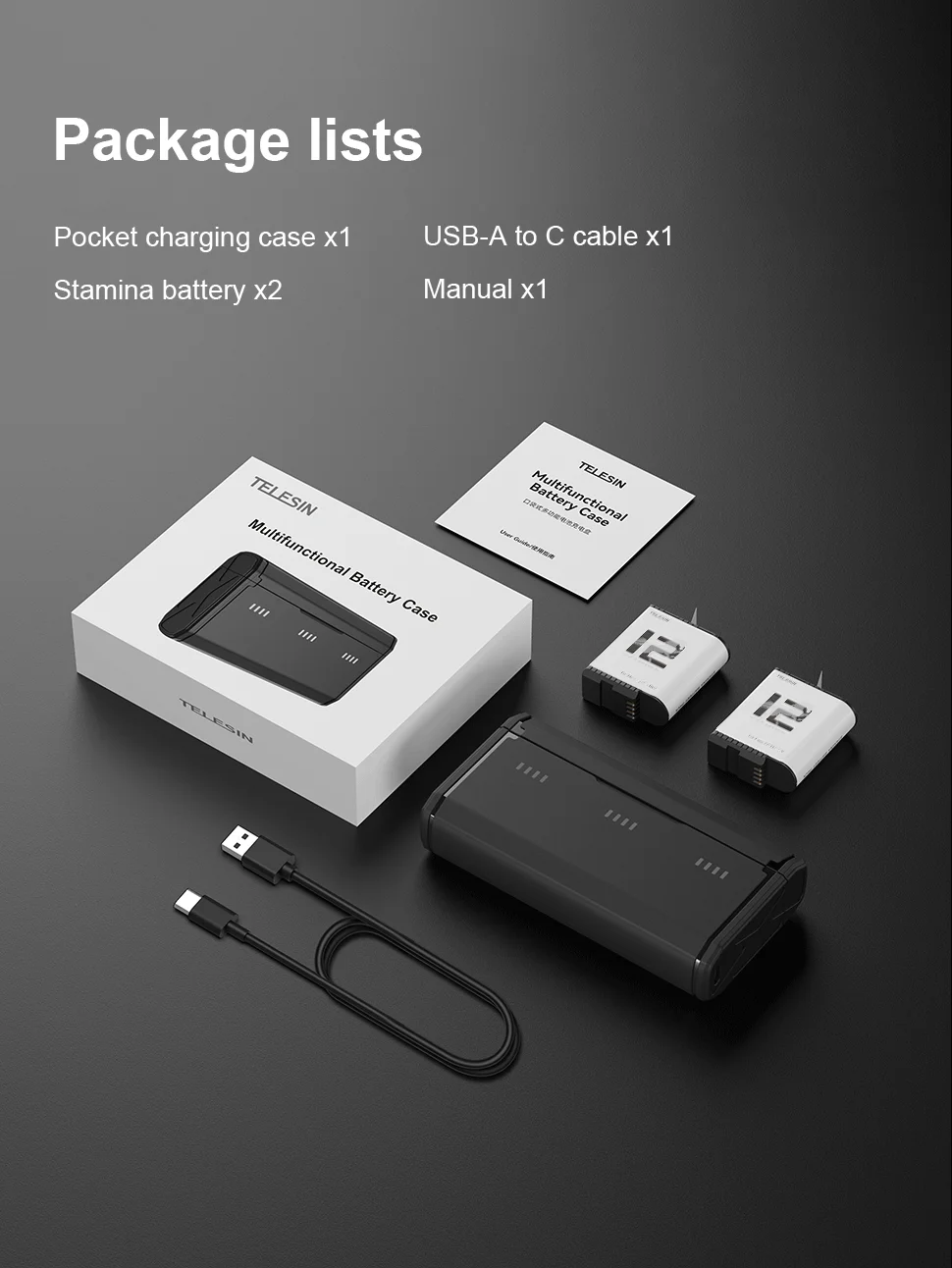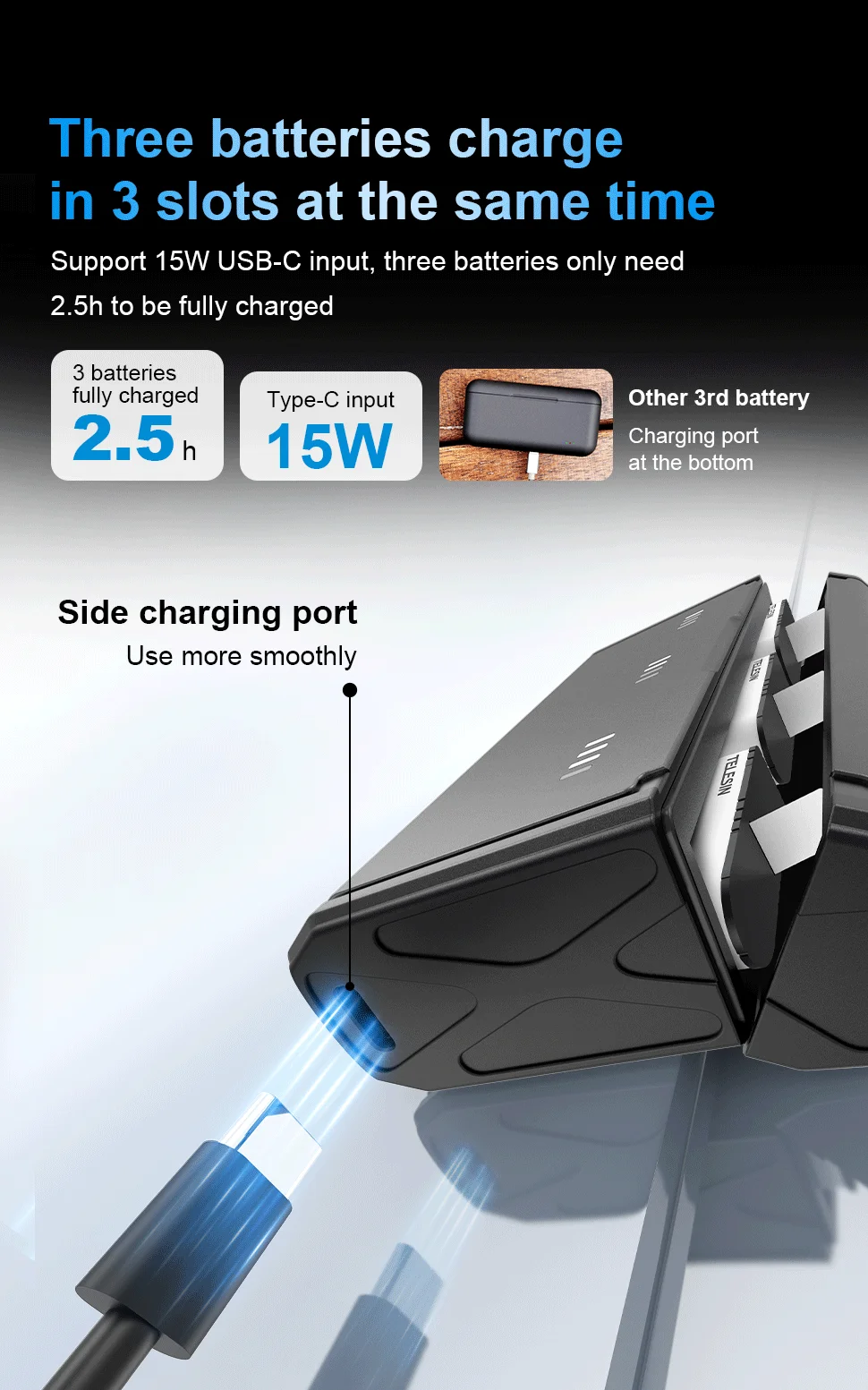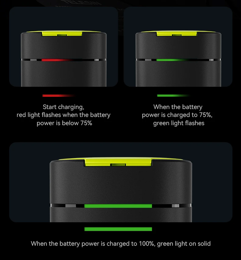 4. The charging box is compatible with GoPro original batteries, third-party batteries, and TELESIN fast-charging batteries. Still, only with TELESIN fast-charging batteries or stamina batteries, fast charging can be achieved.