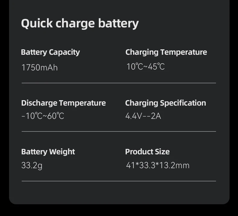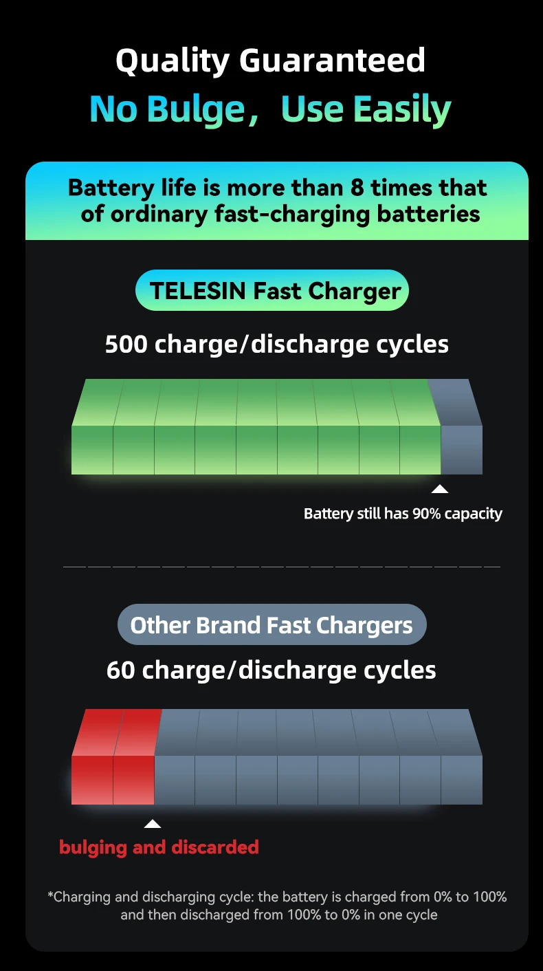 3. Charging speed of the Quick Charge Set: 75% for fast-charging batteries in 30 minutes, 100% in 90 minutes; 100% for ordinary batteries in 150 minutes.