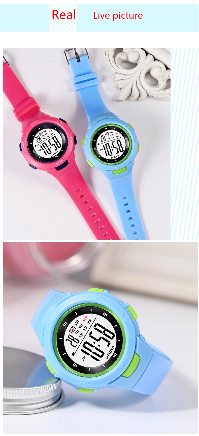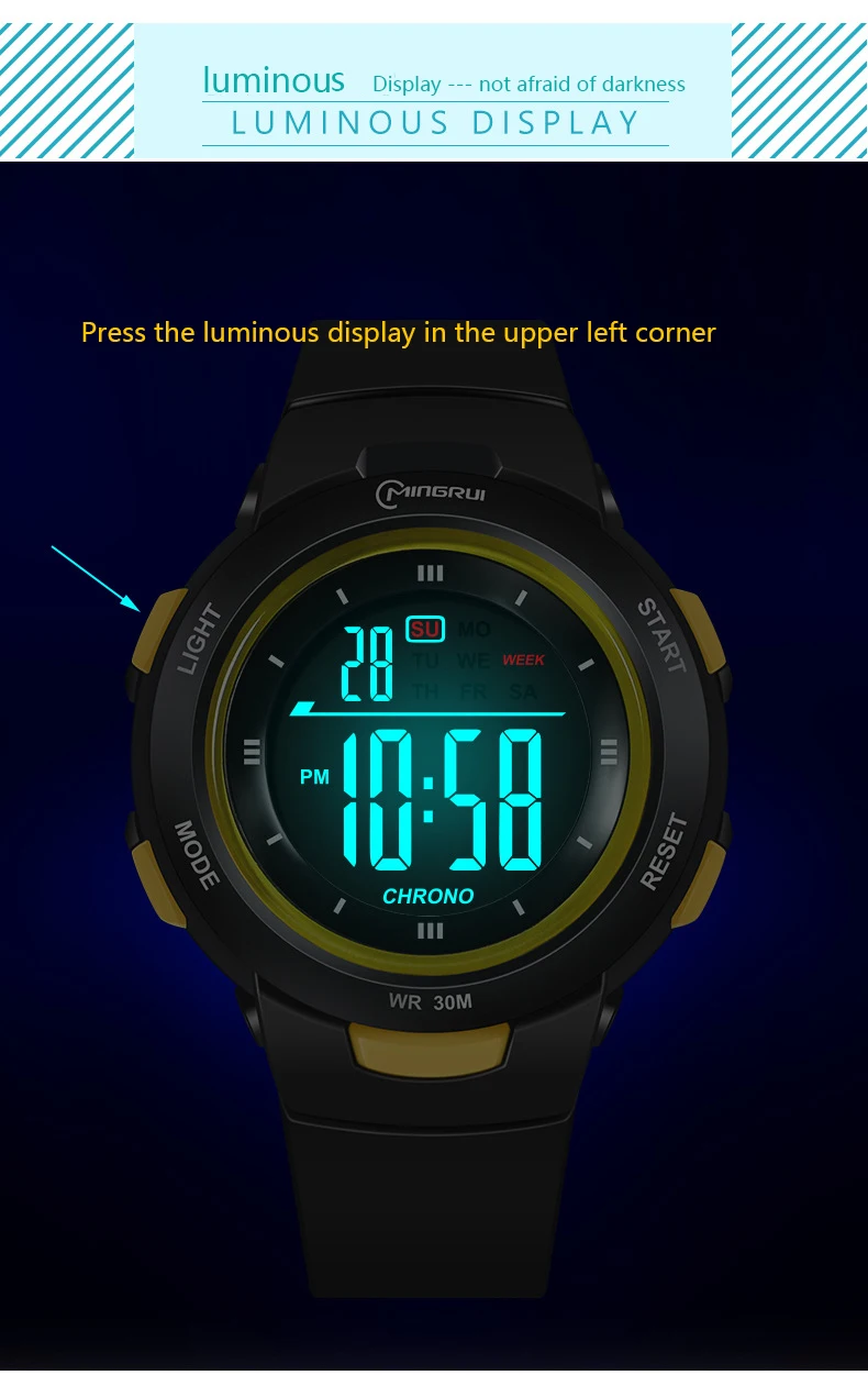 14. Special functions: night light, calendar, week display, waterproof, alarm clock, running time
