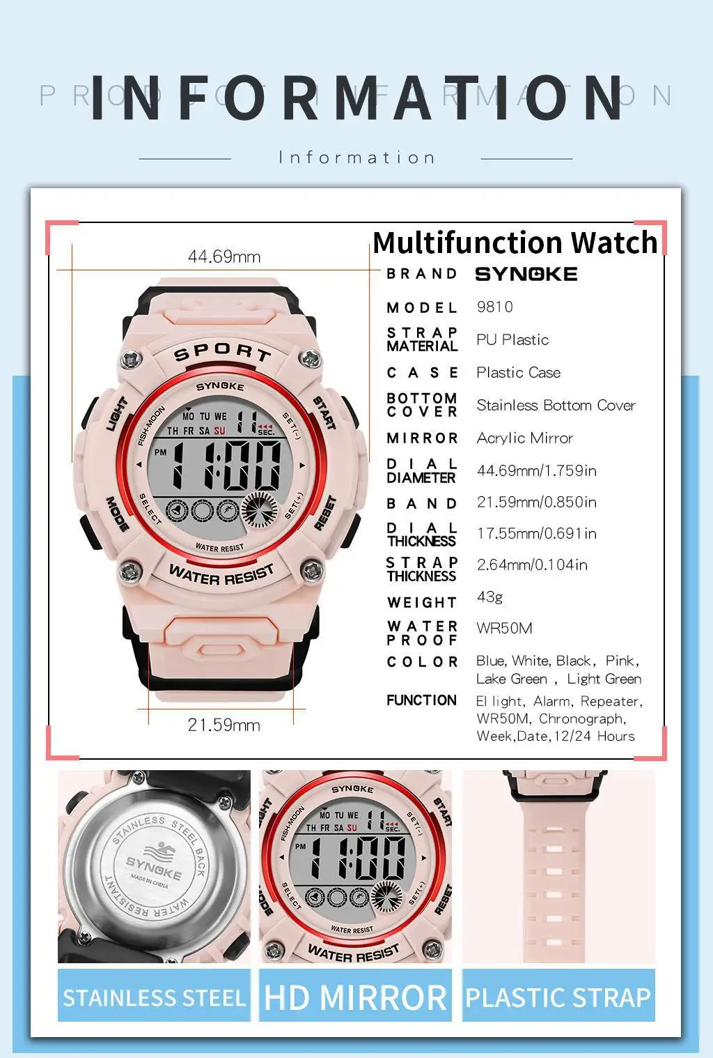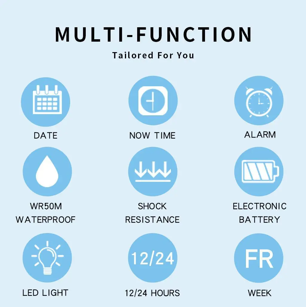 Function introduction: Night light, alarm, WR50M waterproof, hourly alarm, running second timer, displaying weekdays, 12/24 hour system